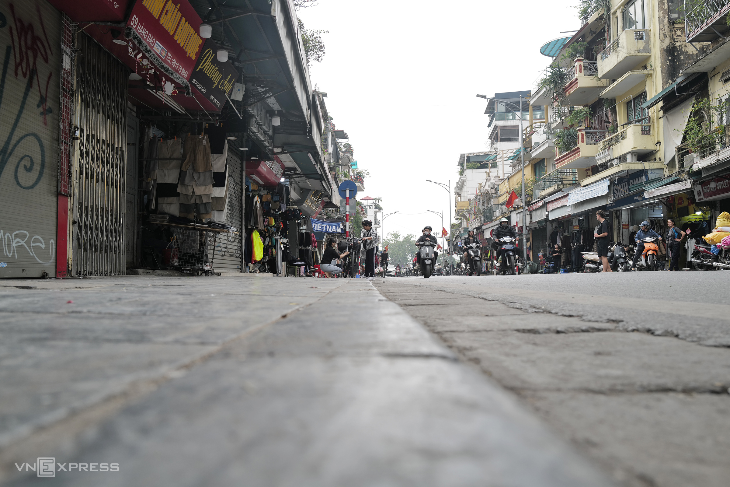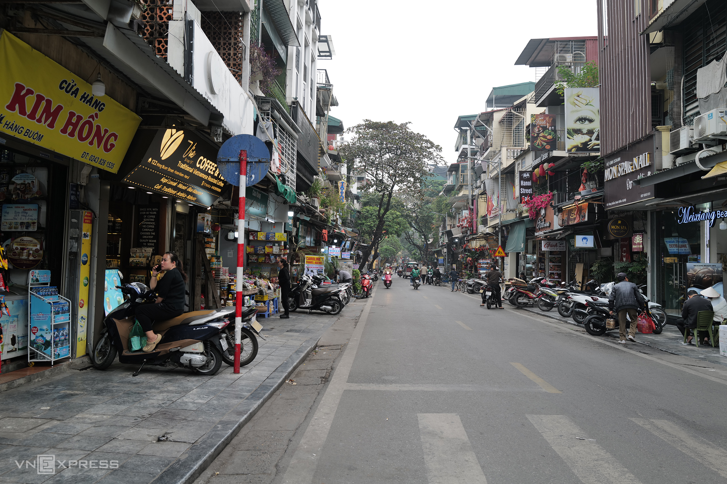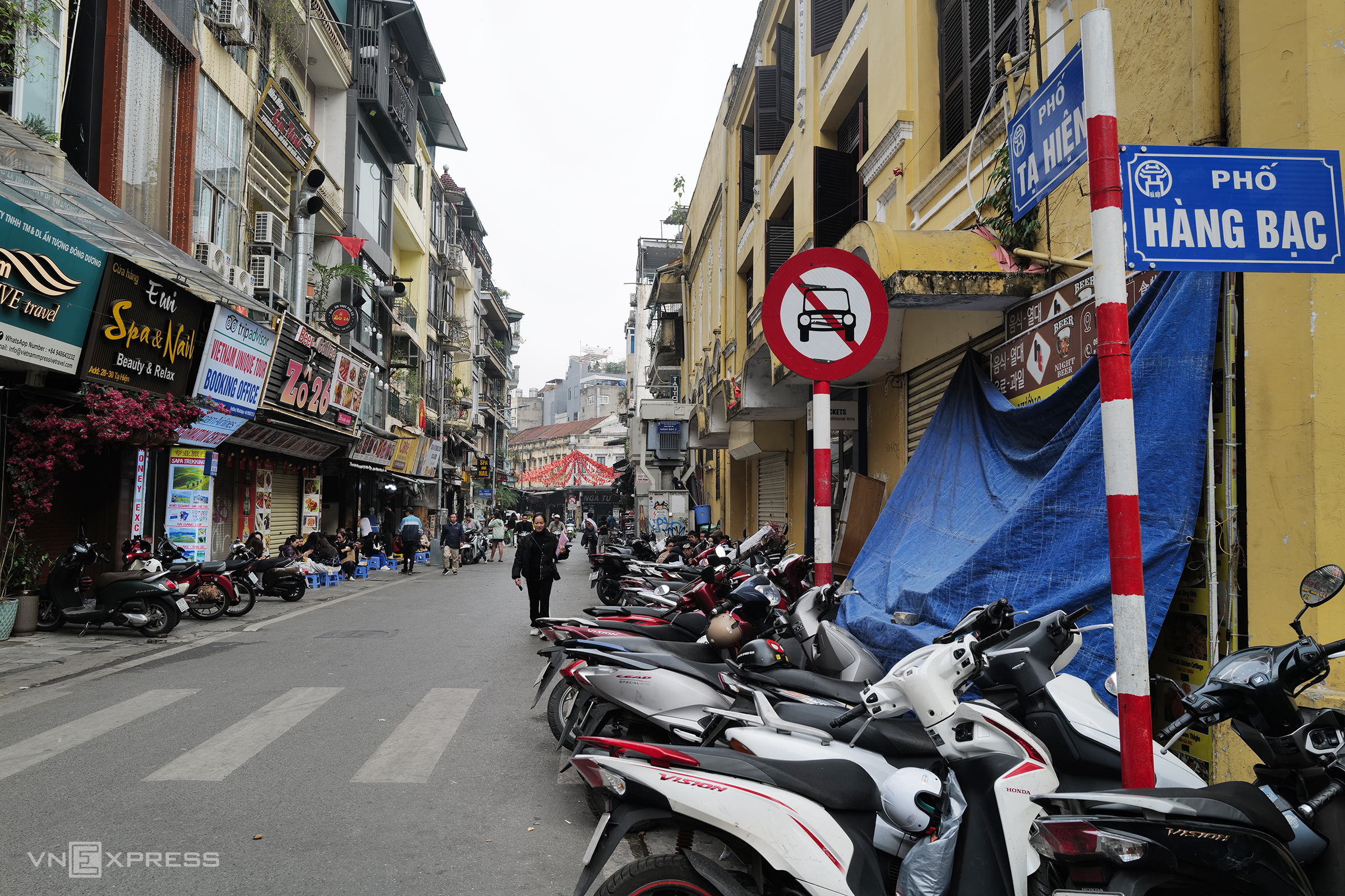 However, at the beginning of Ta Hien Street, motorcycles still overflow onto the roadway, and businesses continue to occupy the entire sidewalk, blocking pedestrian access. |
