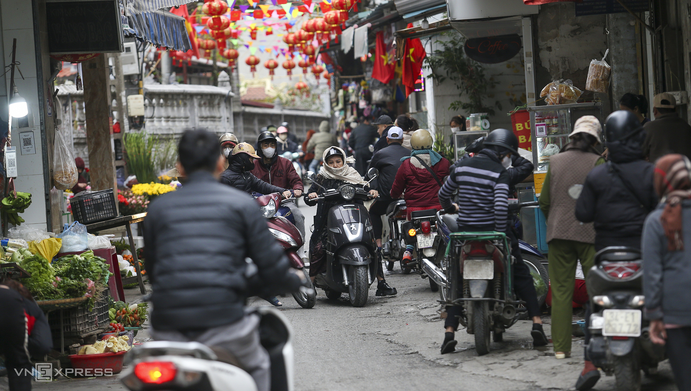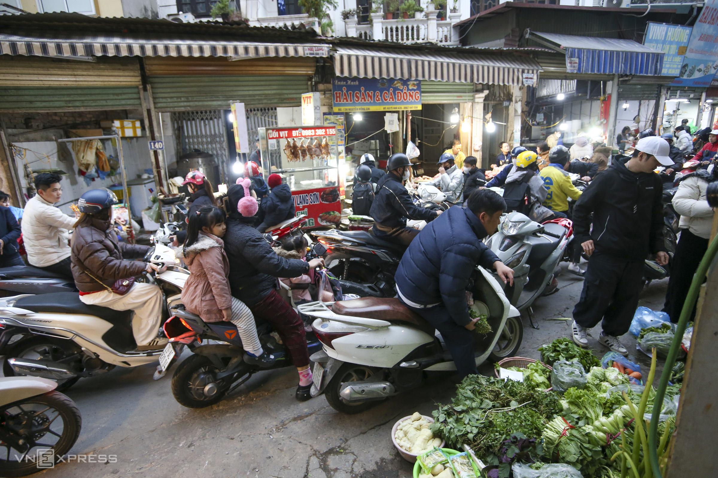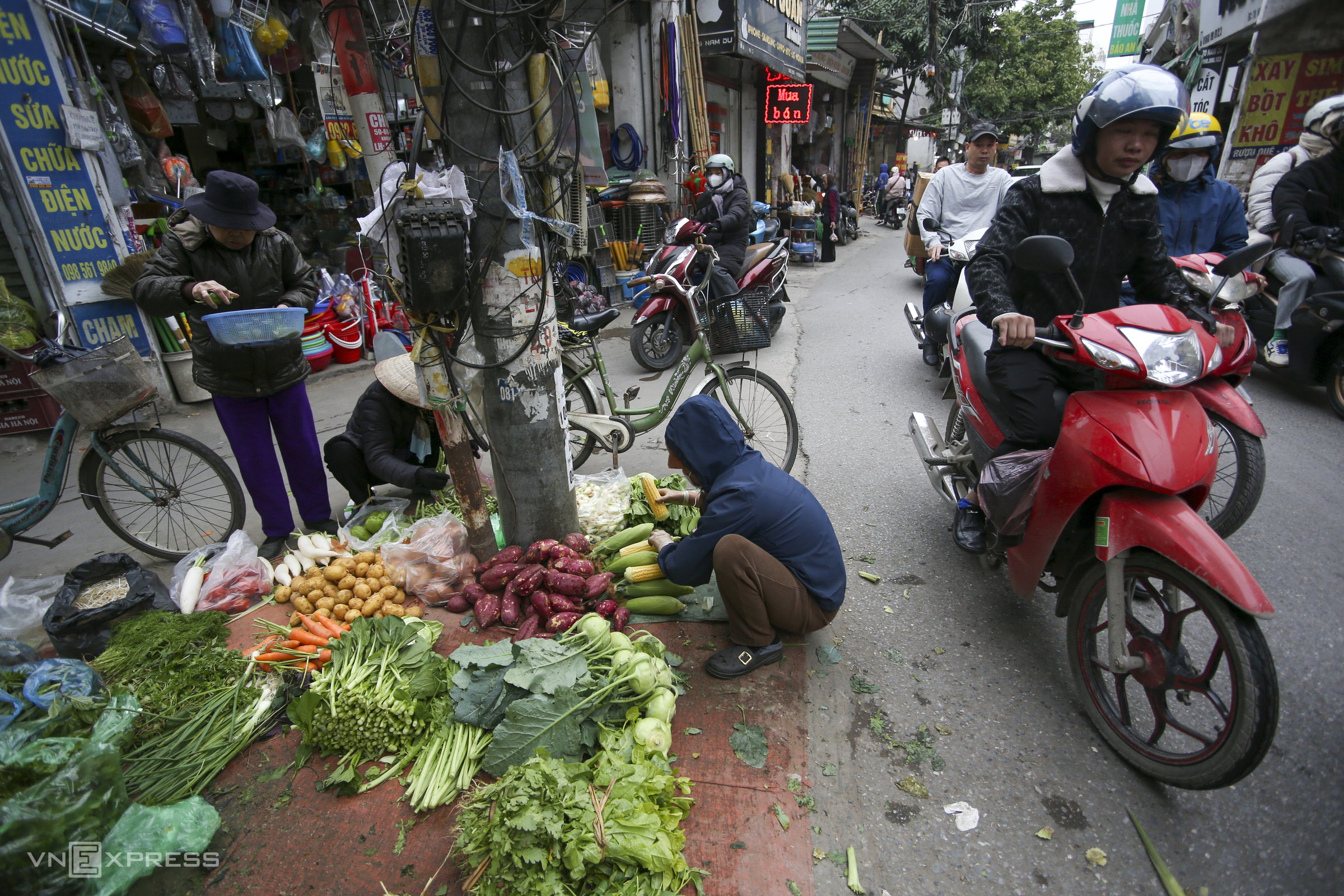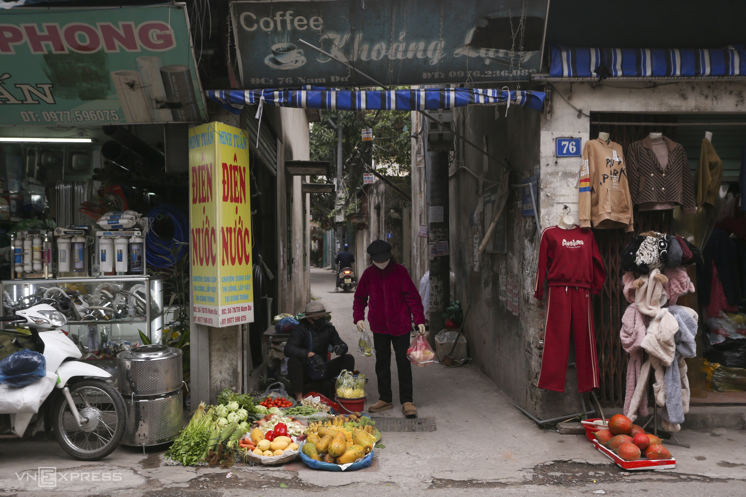 Goods are displayed directly in front of the entrance to alley 76 on Nam Du street, occupying nearly half of the road.