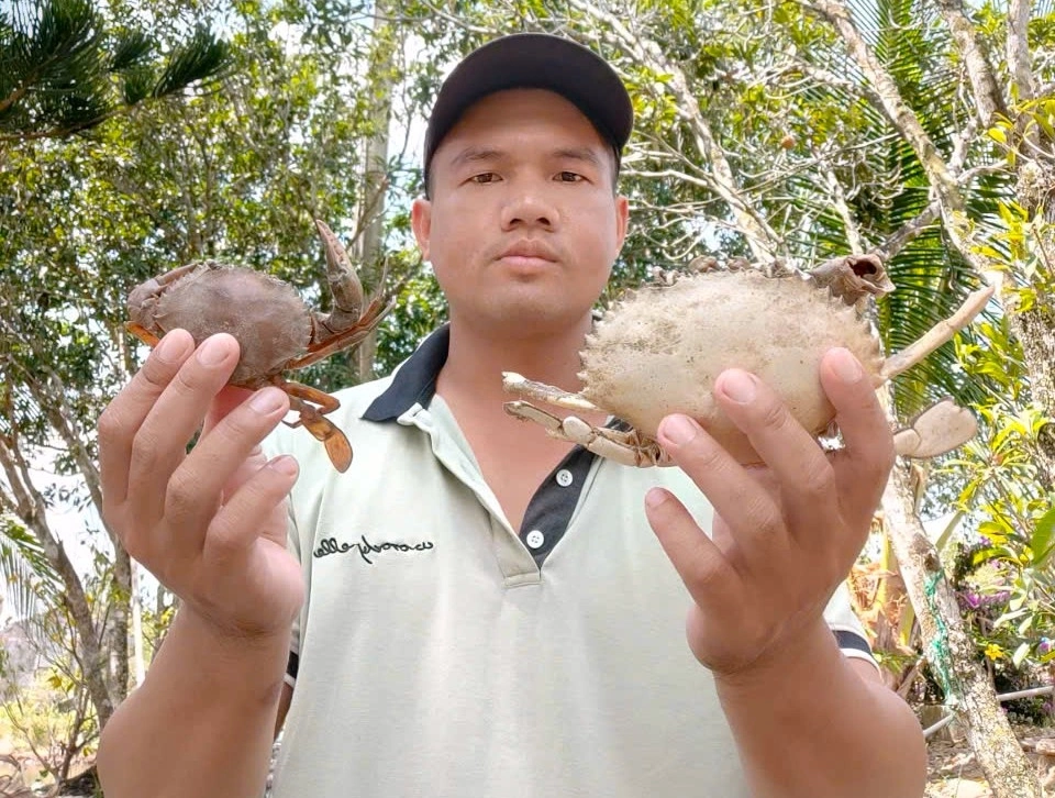 Dang An Hung collects dead crabs to prepare for a new farming season. Photo: An Minh |