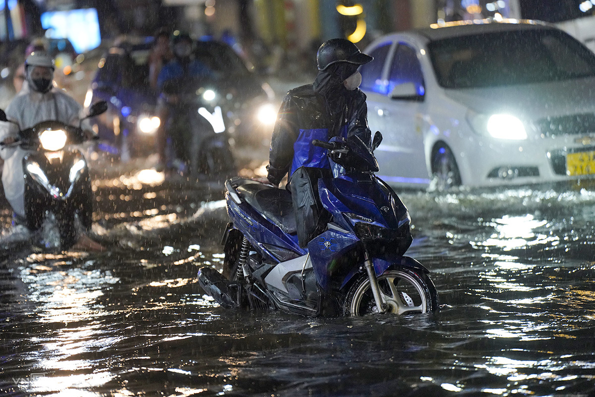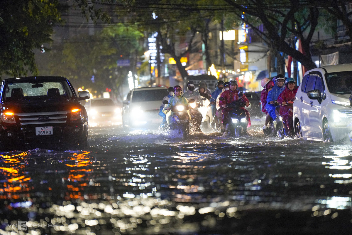Around 6:50 PM, heavy rain began in Da Nang. Within 30 minutes, central streets like Le Duan and Hai Phong were flooded up to half a wheel's height. Hoa, a resident of Thanh Khe ward, was taking her child to extra classes on Ong Ich Khiem Street, about one kilometer from her home, and had to navigate several flooded sections.
