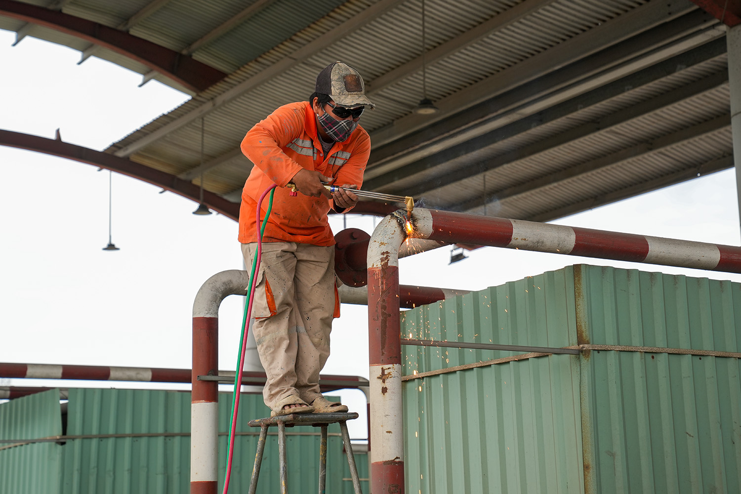 Workers use cutting torches to dismantle steel structural components at the T3 toll booth. *Truong Ha* |