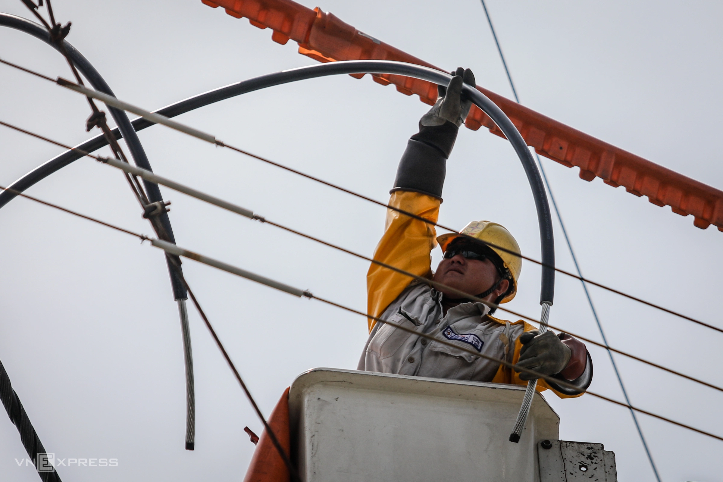 EVN HCMC workers perform live-line maintenance on a 22kV power line in Tan Thuan Export Processing Zone. Photo: Thanh Nguyen