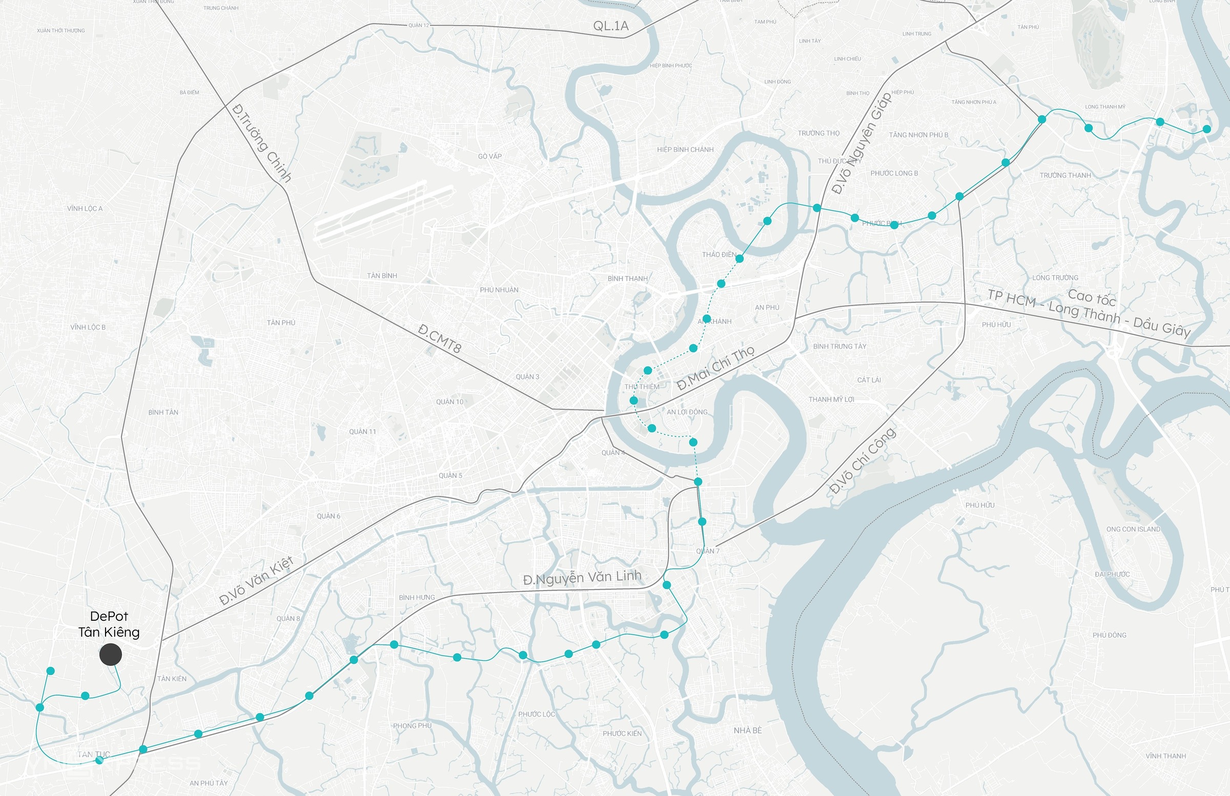 The entire line is expected to feature 34 stations (12 underground, 22 elevated) along with two depots located in Tan Kien and Long Truong. The section passing through the Thu Thiem New Urban Area is expected to include 6 stations.