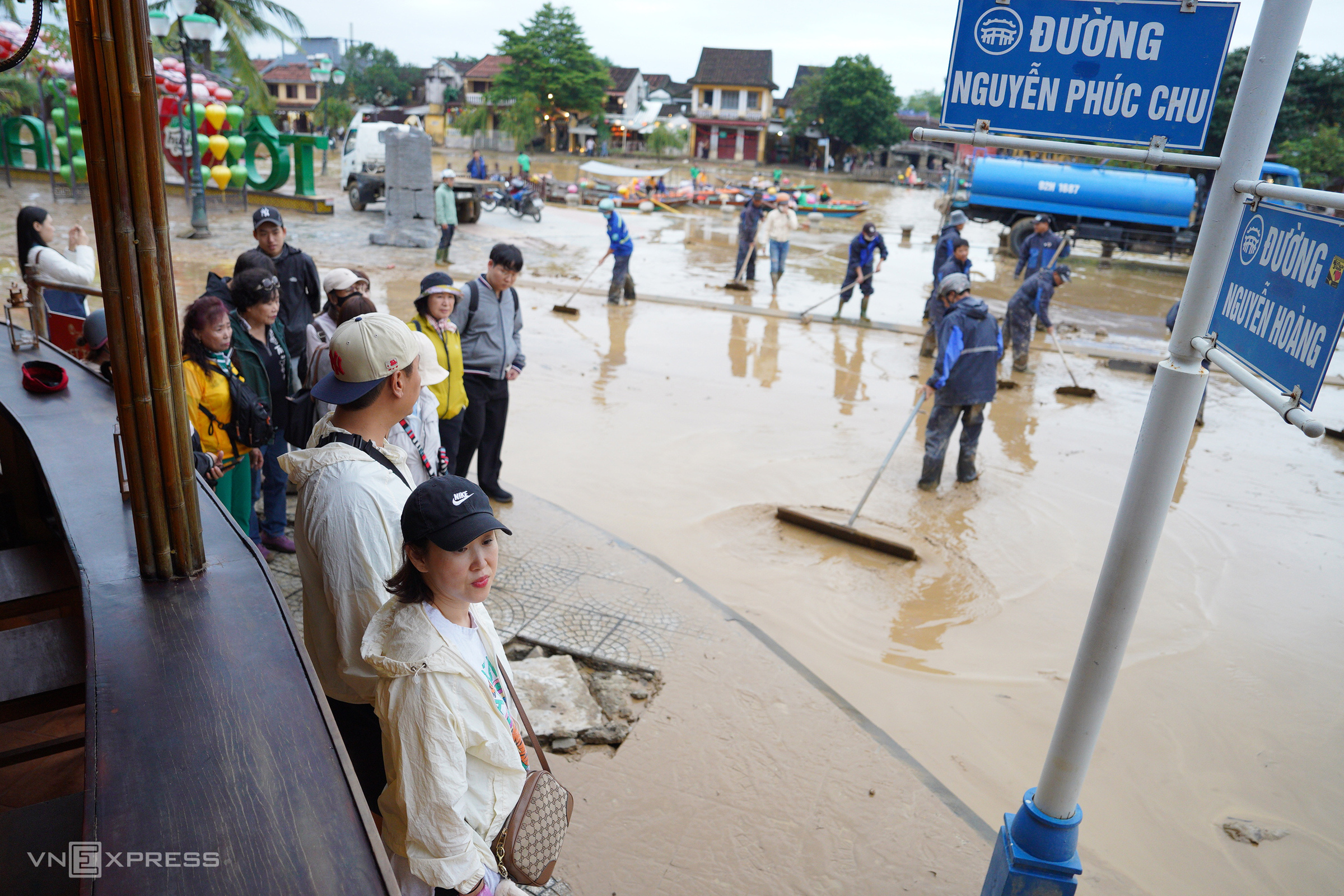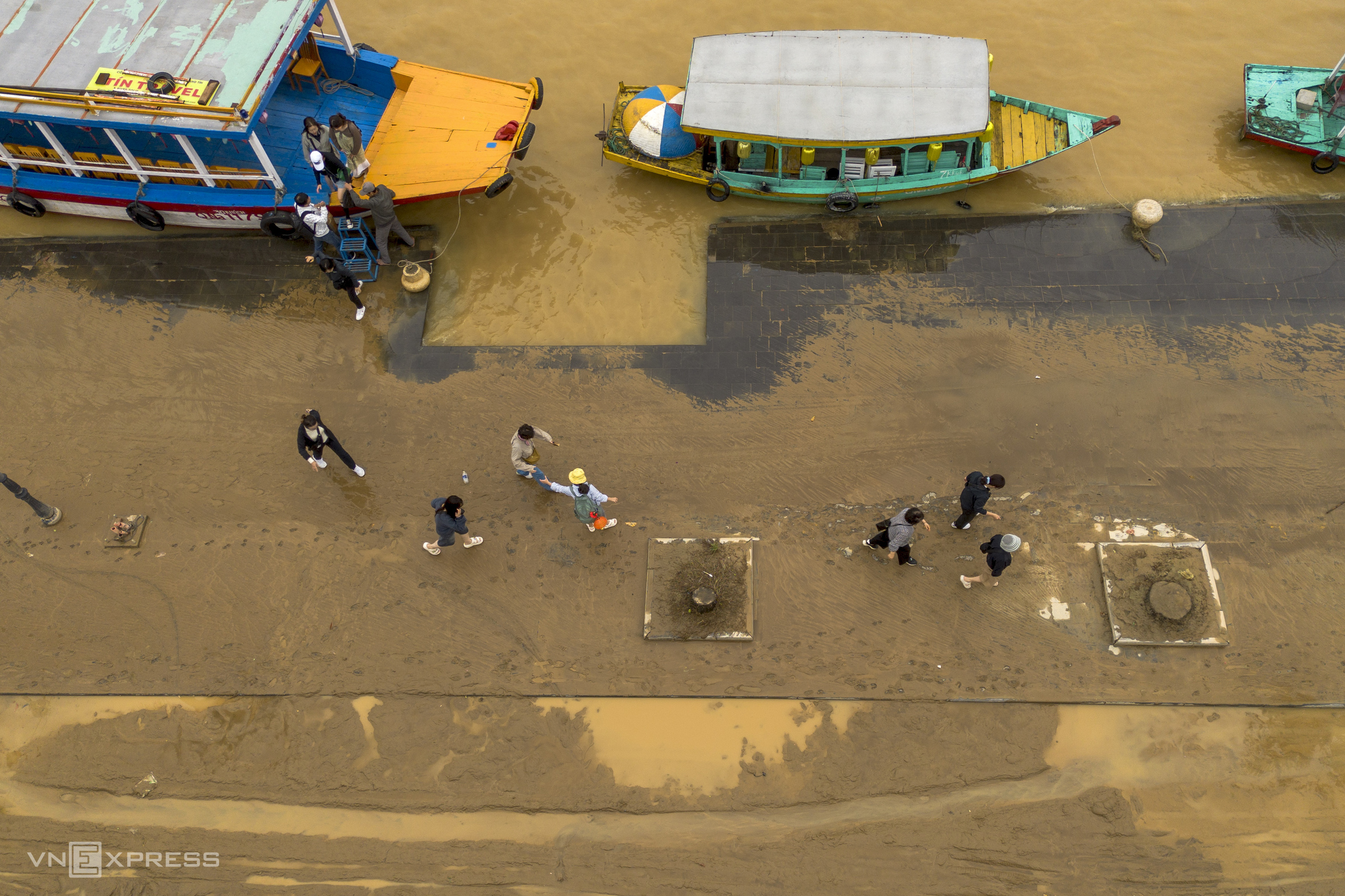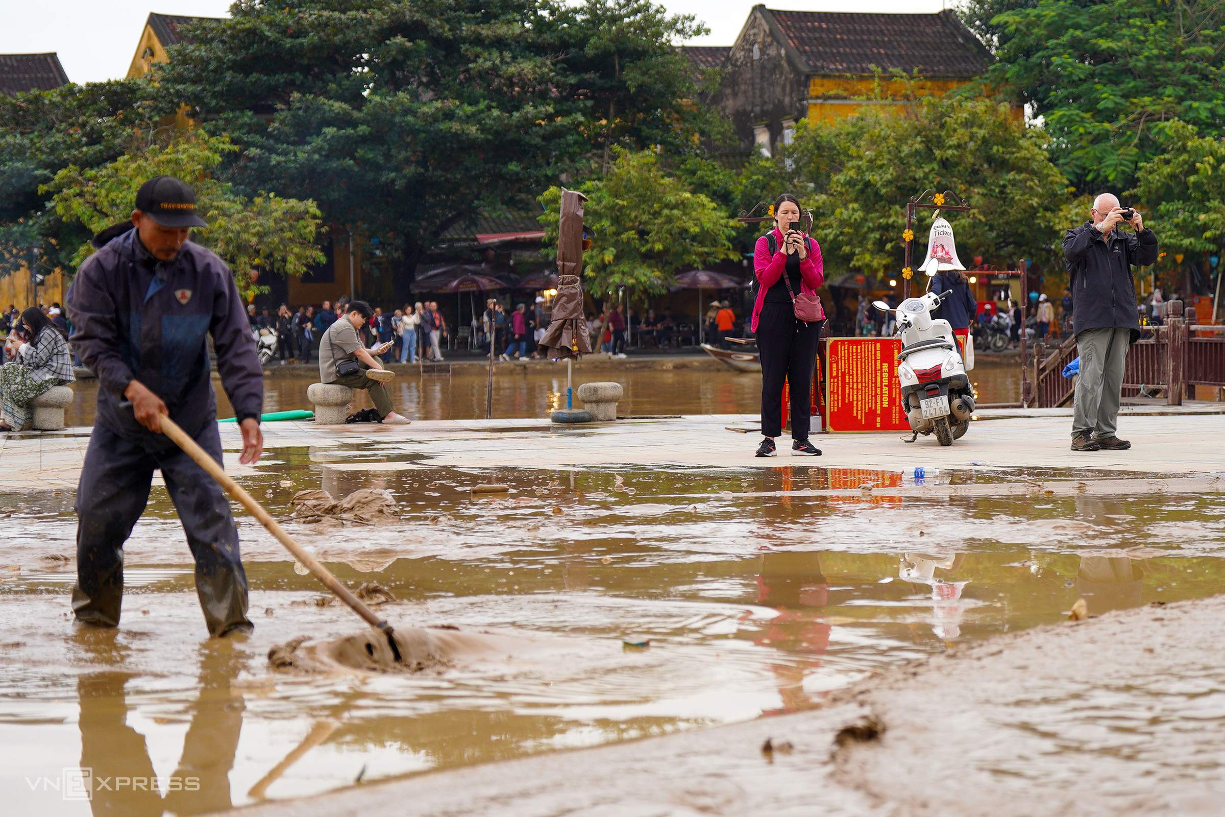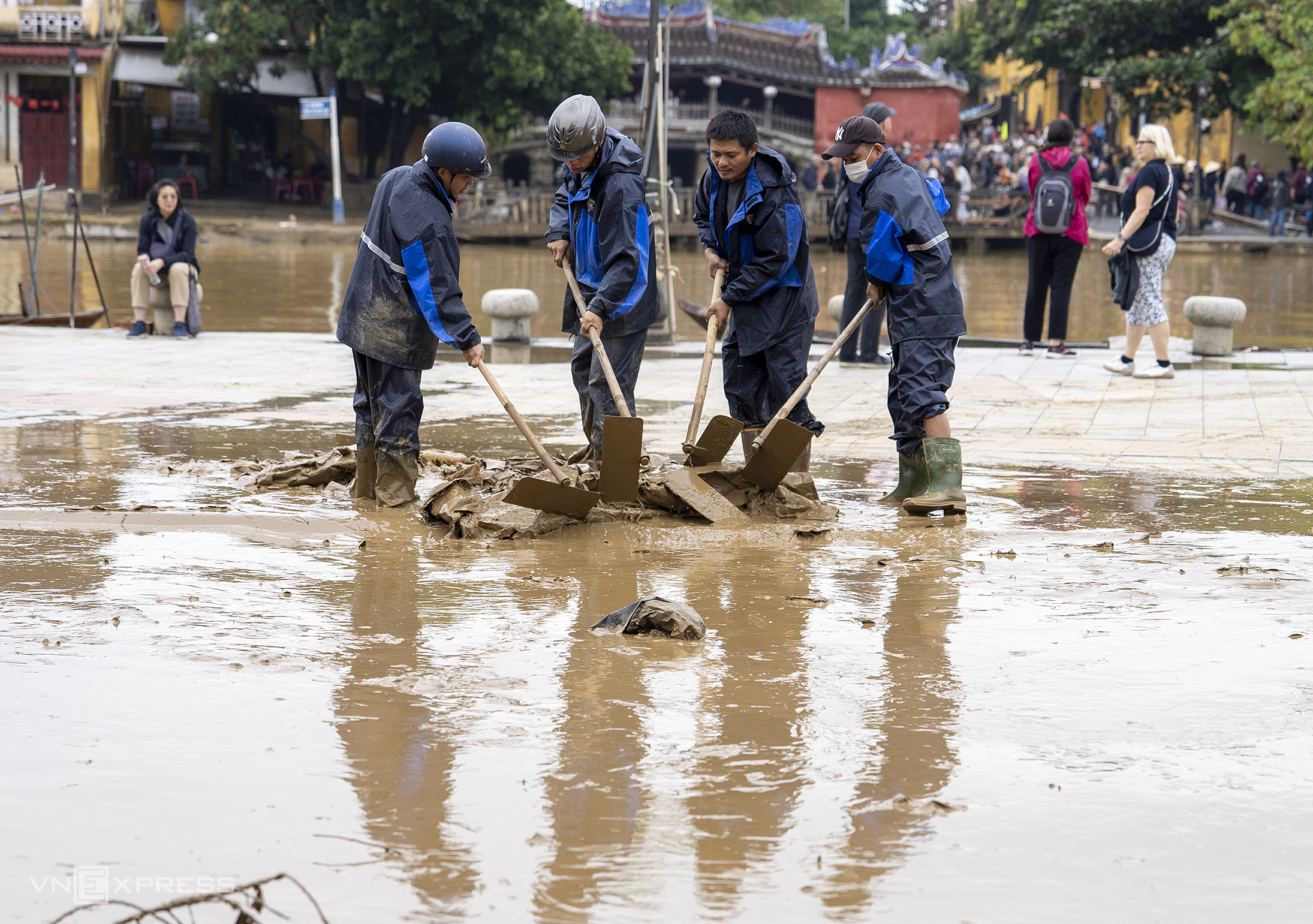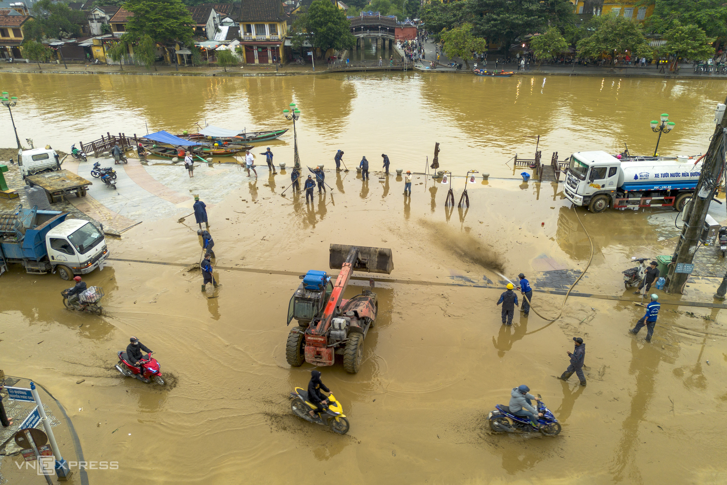 Since the afternoon of 21/11, floodwaters have mostly receded from the ancient town's pedestrian streets and the residential area across the Hoai river. Flooding from the upper Thu Bon river, caused by heavy rain and hydropower dam discharges, left the ancient town covered in soft mud, necessitating a large-scale cleanup effort by authorities and residents. A section of Bach Dang street remained submerged by about 0,4 meters. Employees of Hoi An Public Works Joint Stock Company used specialized excavators and water tankers to clear the mud layer on many streets.