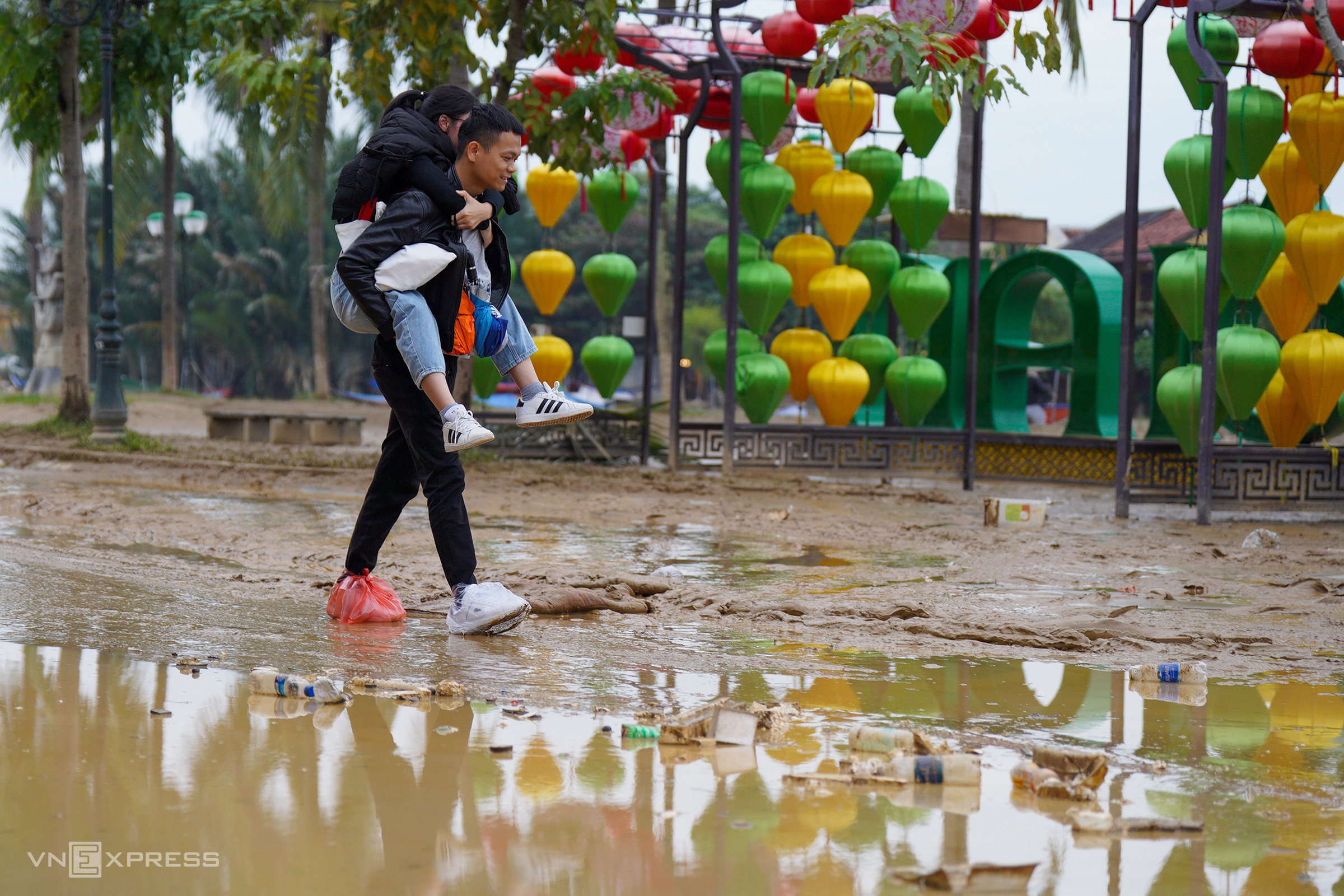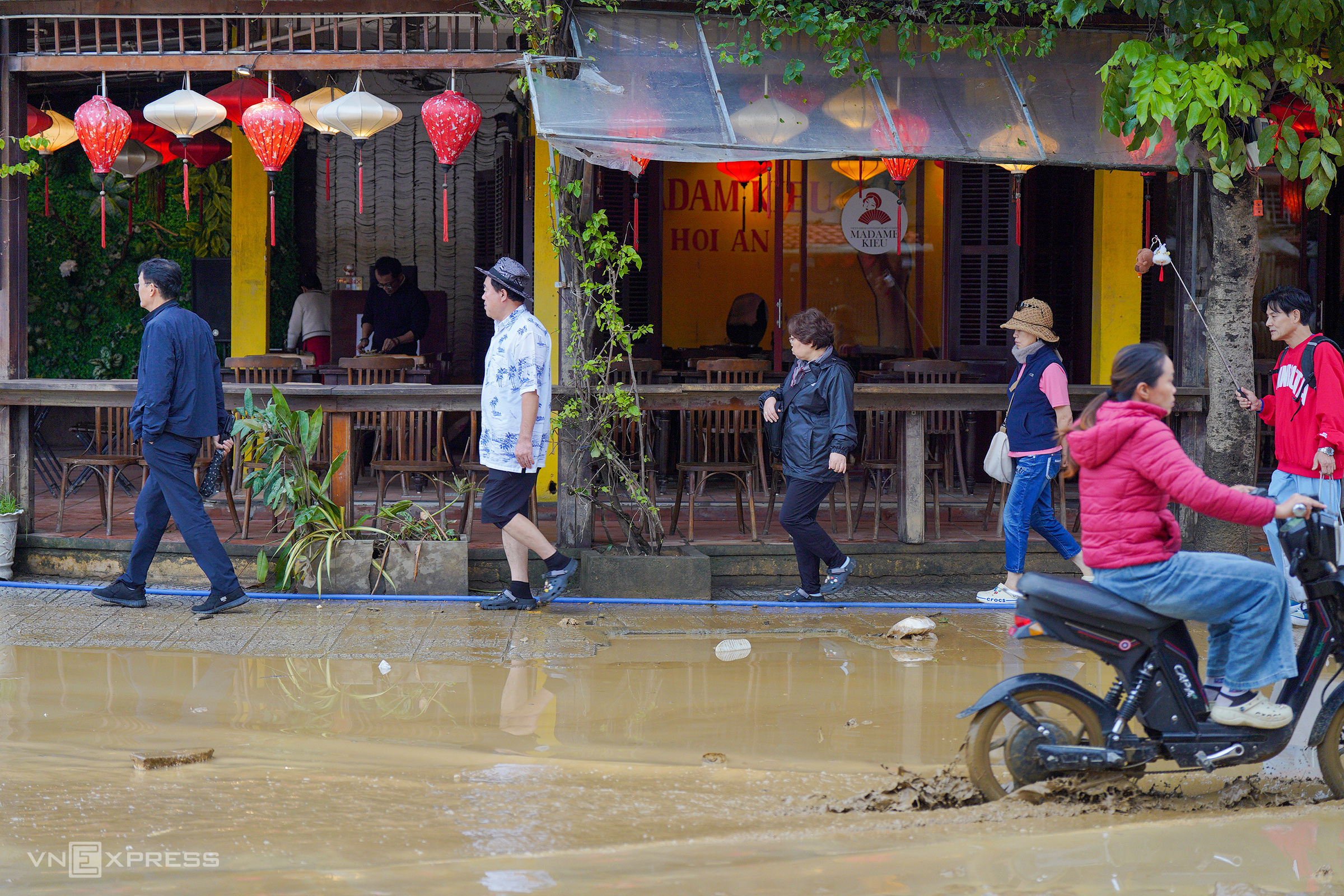 Despite many streets still being covered in soft mud after the flood, Hoi An ancient town continued to attract many tourists. Numerous foreigners stopped to film authorities and residents clearing mud on the streets. |