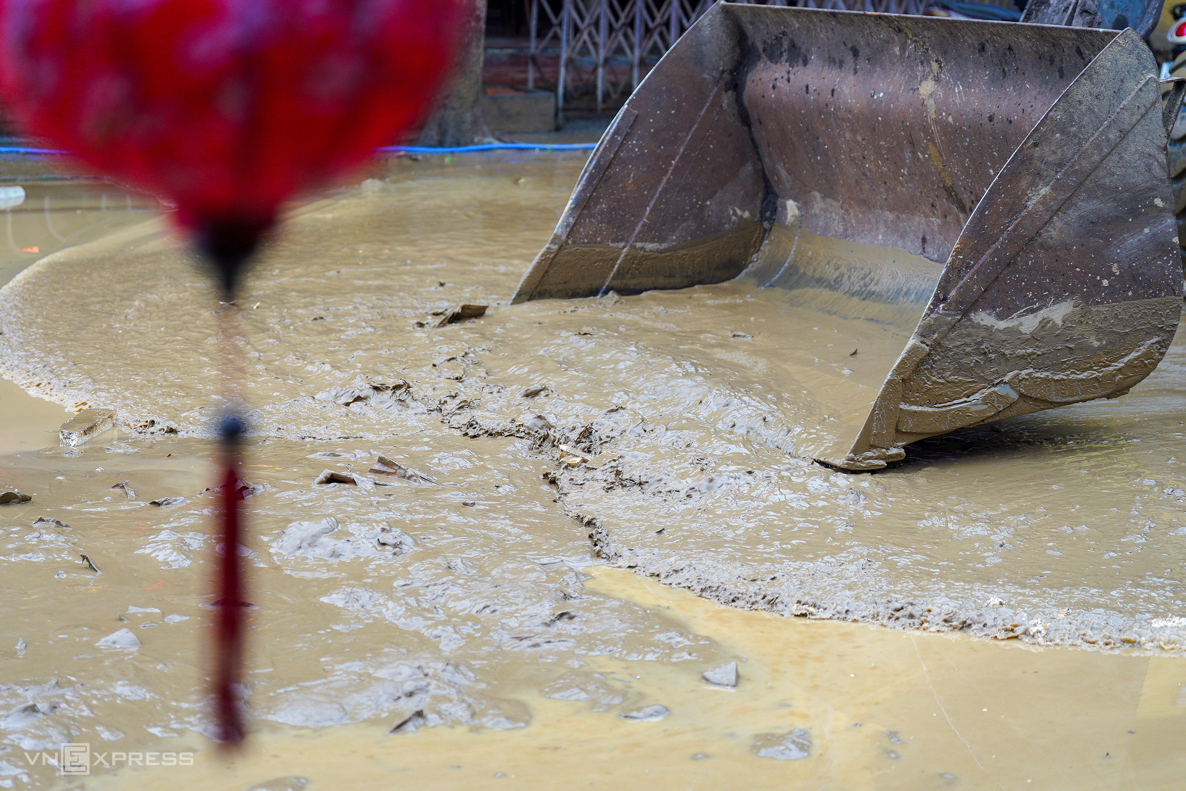 Excavators gathered mud from inner streets and pushed it towards Nguyen Phuc Chu street along the Hoai river. |