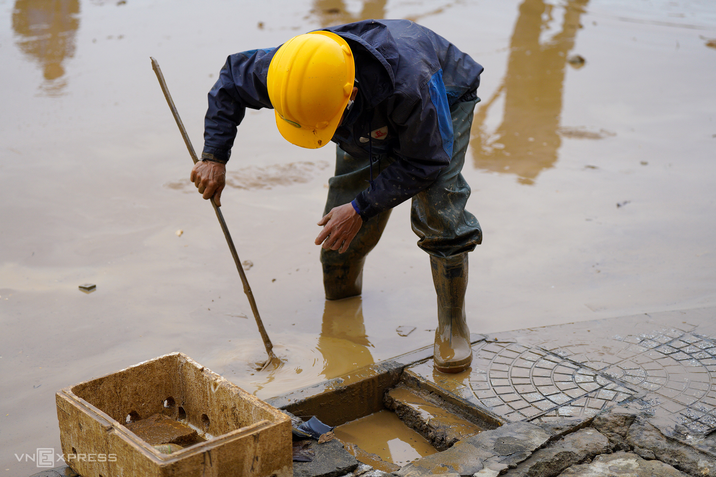 To facilitate rapid water drainage, environmental workers had to clear drainage inlets blocked by trash or clogged with mud. |