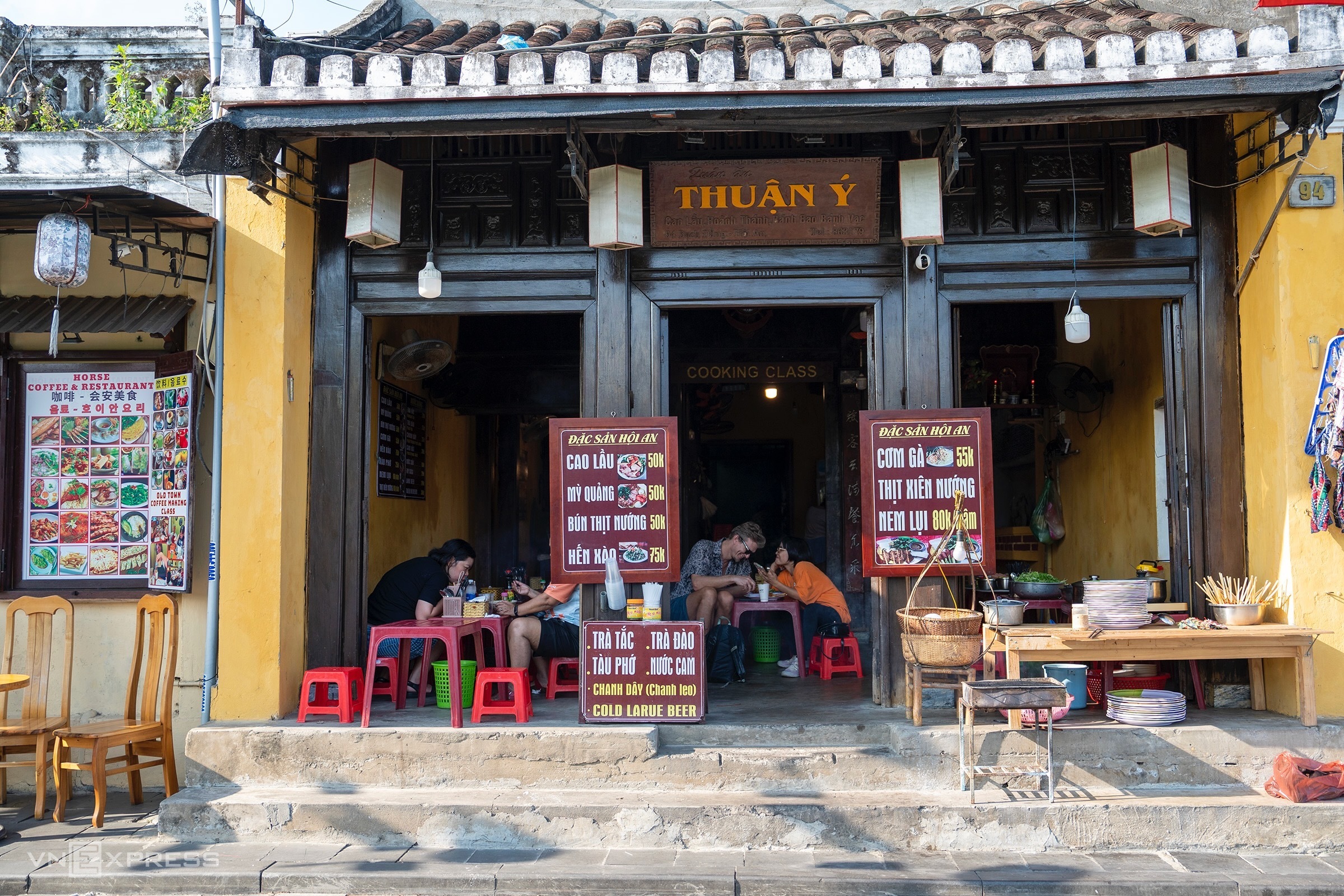 Hoi An ancient town has streets with no sidewalks, or only about one-half meter wide. Some businesses place tables and chairs within the permitted area, but their signs and menus are incorrectly positioned.
