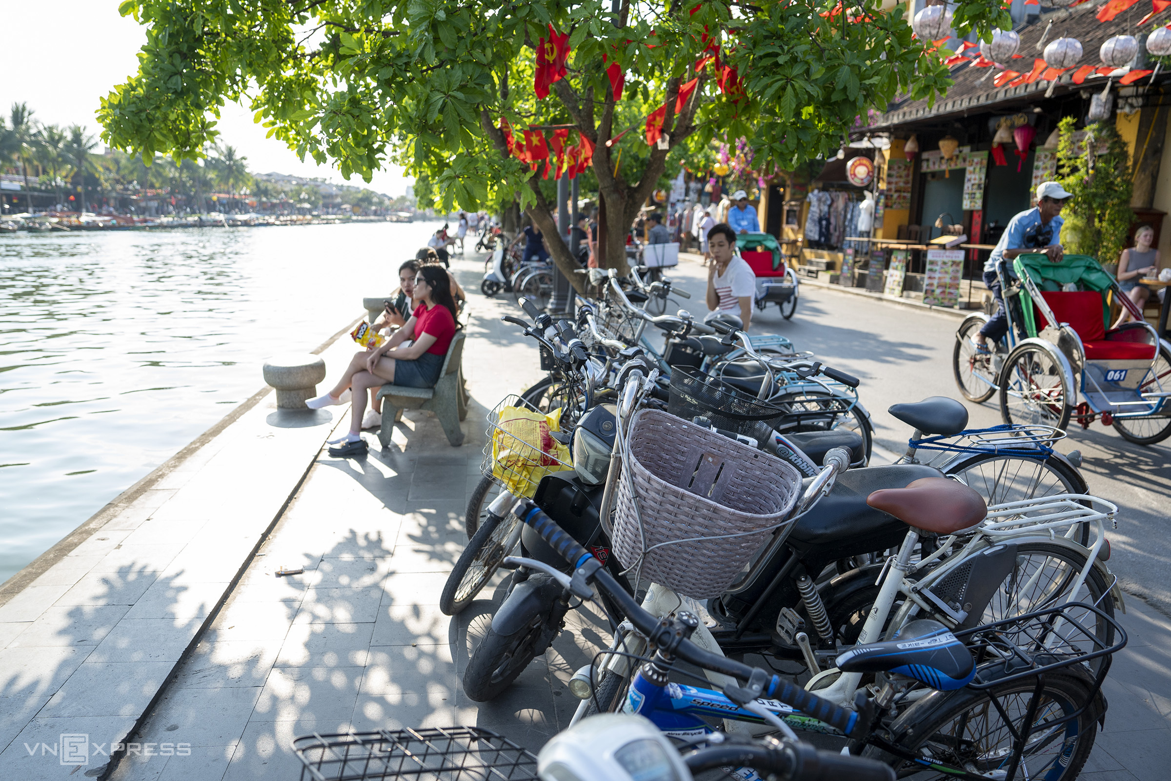 On the Hoai River embankment, bicycles and electric bikes parked by residents obstruct pathways, detracting from the urban landscape.