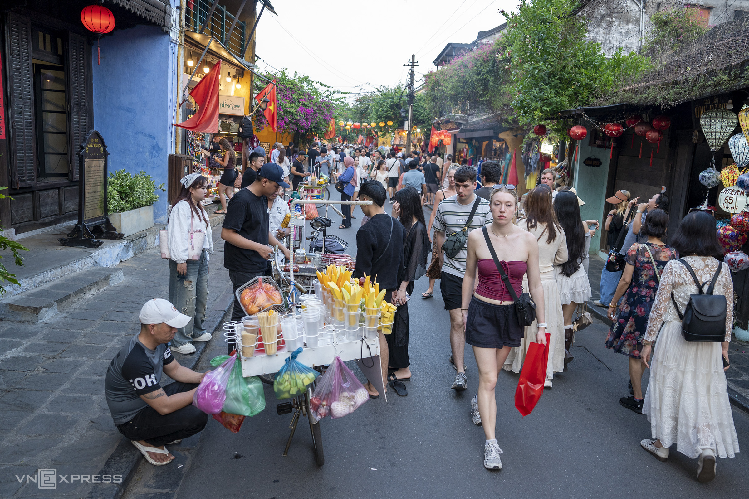 On pedestrian streets such as Tran Phu, Nguyen Thai Hoc, and Le Loi, groups of three or four bicycles often park directly on the road, selling mango salad, grilled items, smoke ice cream, and souvenirs. This significantly impedes pedestrian movement and disrupts the flow of foot traffic.