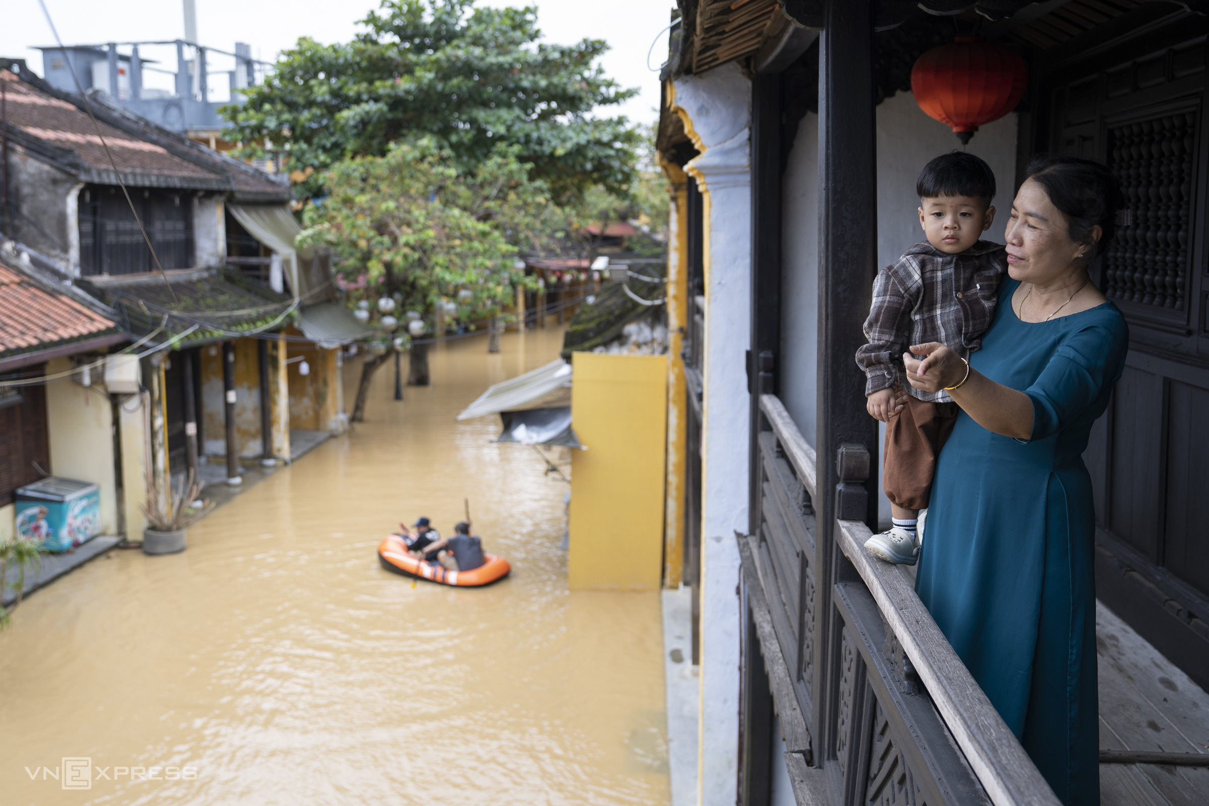 Many tourists rented boats to navigate the ancient town, experiencing the flood season in Hoi An, while local residents, including children, accustomed to the flooded landscape, sat calmly in front of their homes watching the floodwaters.