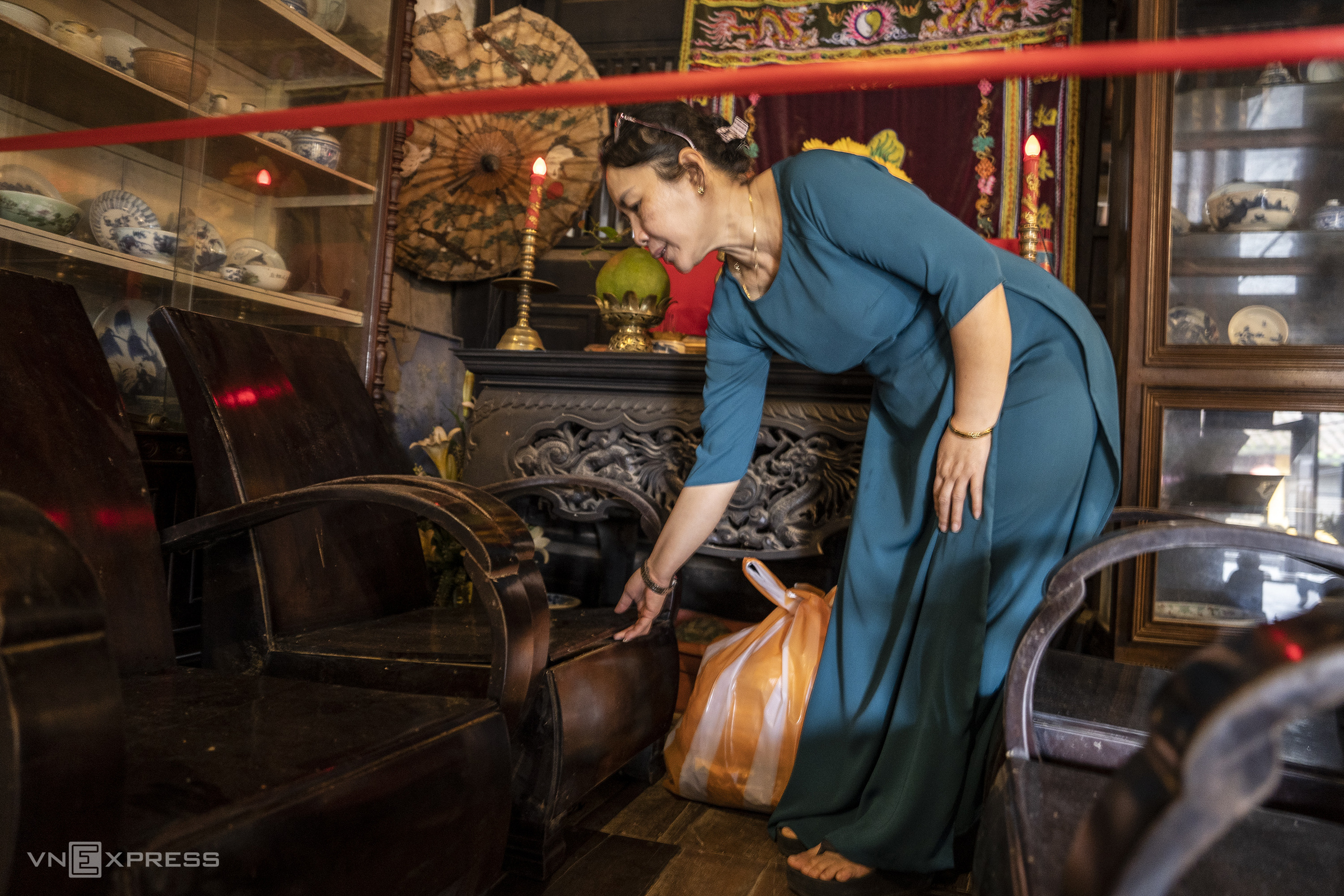 Inside Phung Hung ancient house (number 4 Nguyen Thi Minh Khai street, next to Chua Cau), staff elevated tables and chairs using plastic stools. The flood on the night of 28/10 had submerged the ancient house by more than 1 m, damaging many properties.