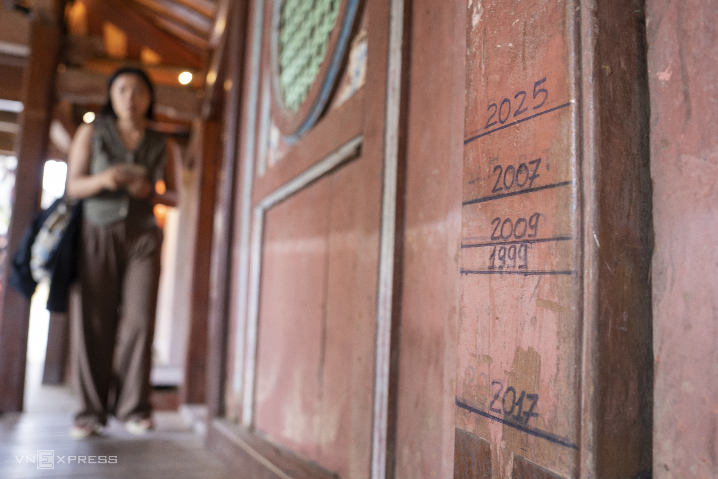 The water level inside Chua Cau was about 1 m lower than on the night of 28/10. On a wooden board at the entrance of the Pagoda Bridge, staff had marked flood levels from previous years, with 2025 showing the highest level since the historic flood of 1999.