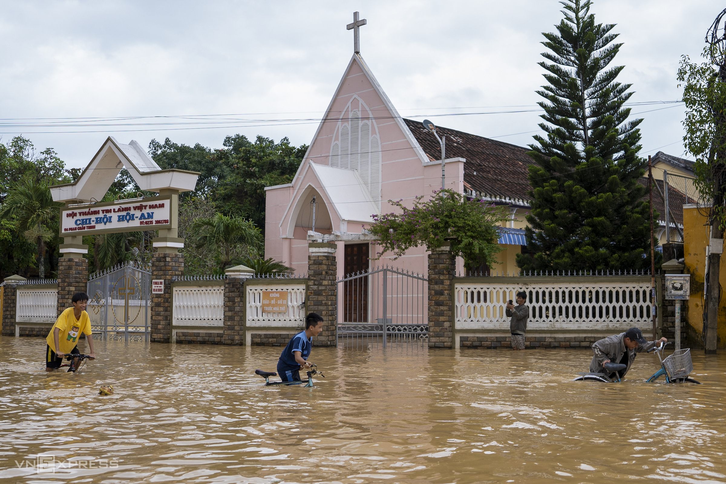 In front of the Hoi An Protestant Church on Phan Chu Trinh street, water was still about 0.8 m deep on the evening of 18/11, with many students cycling and playing. The Hoai River Square area in front of the church was also surrounded by floodwaters.