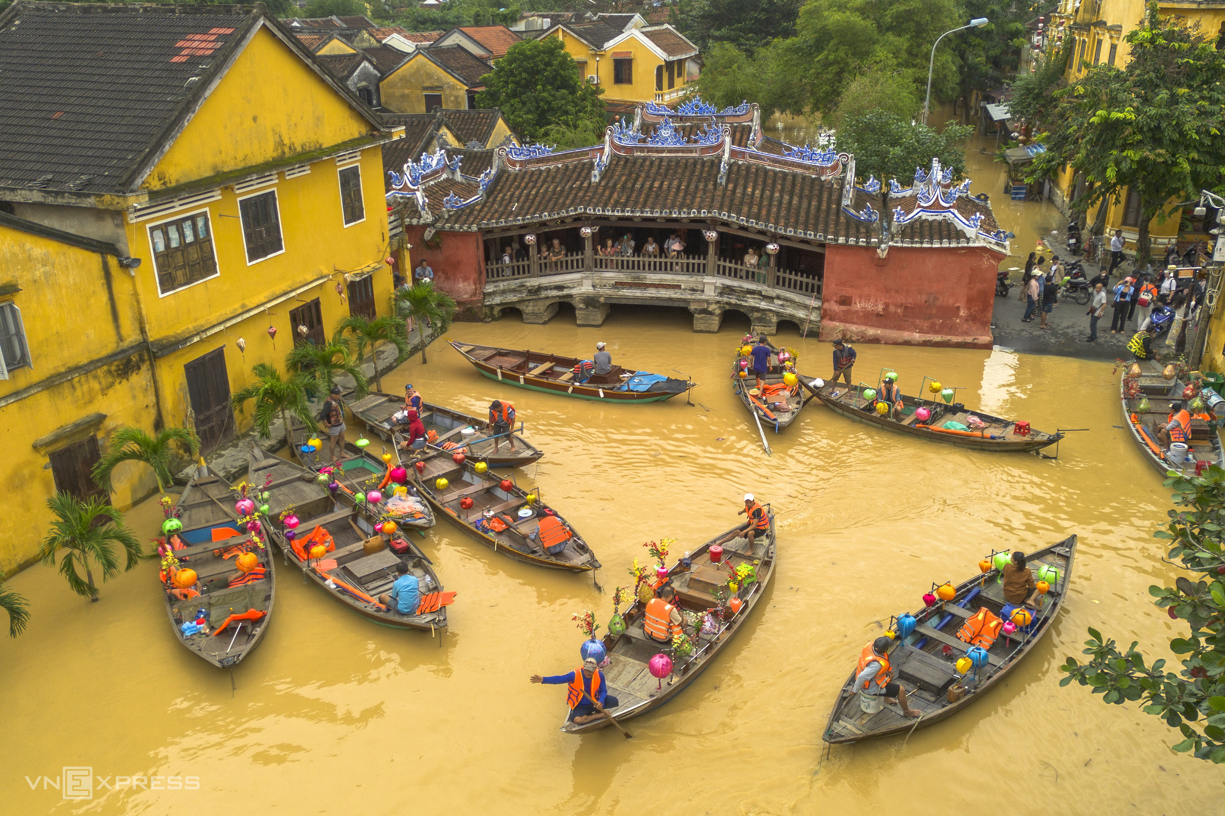 Chua Cau, Hoi An’s iconic landmark, remained crowded with visitors, despite requiring wading through several streets to reach. A rare dry area amid the floods, the beginning of Tran Phu street near Chua Cau became a hub where small boats picked up visitors and residents, ferrying them between the submerged areas and the town.