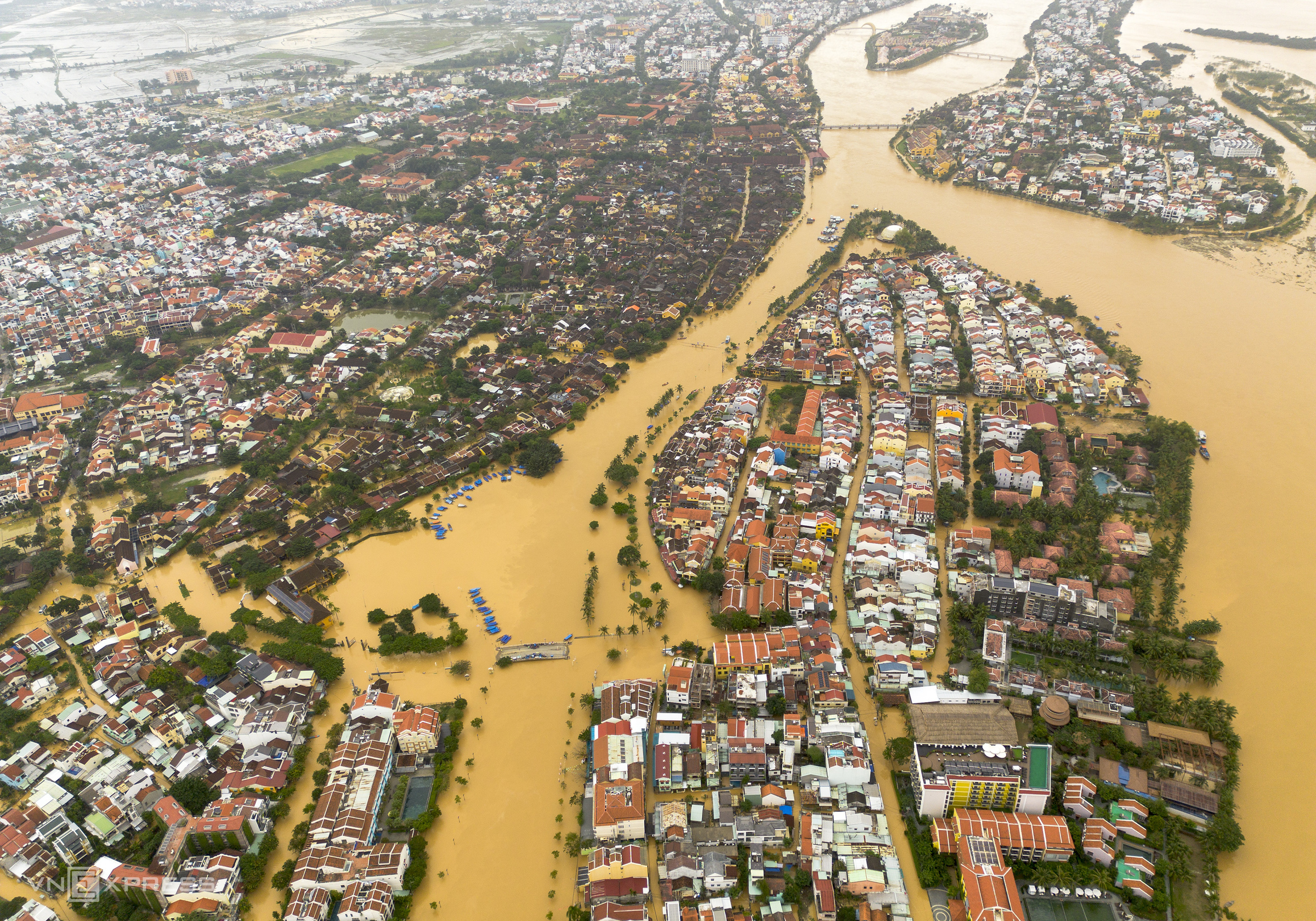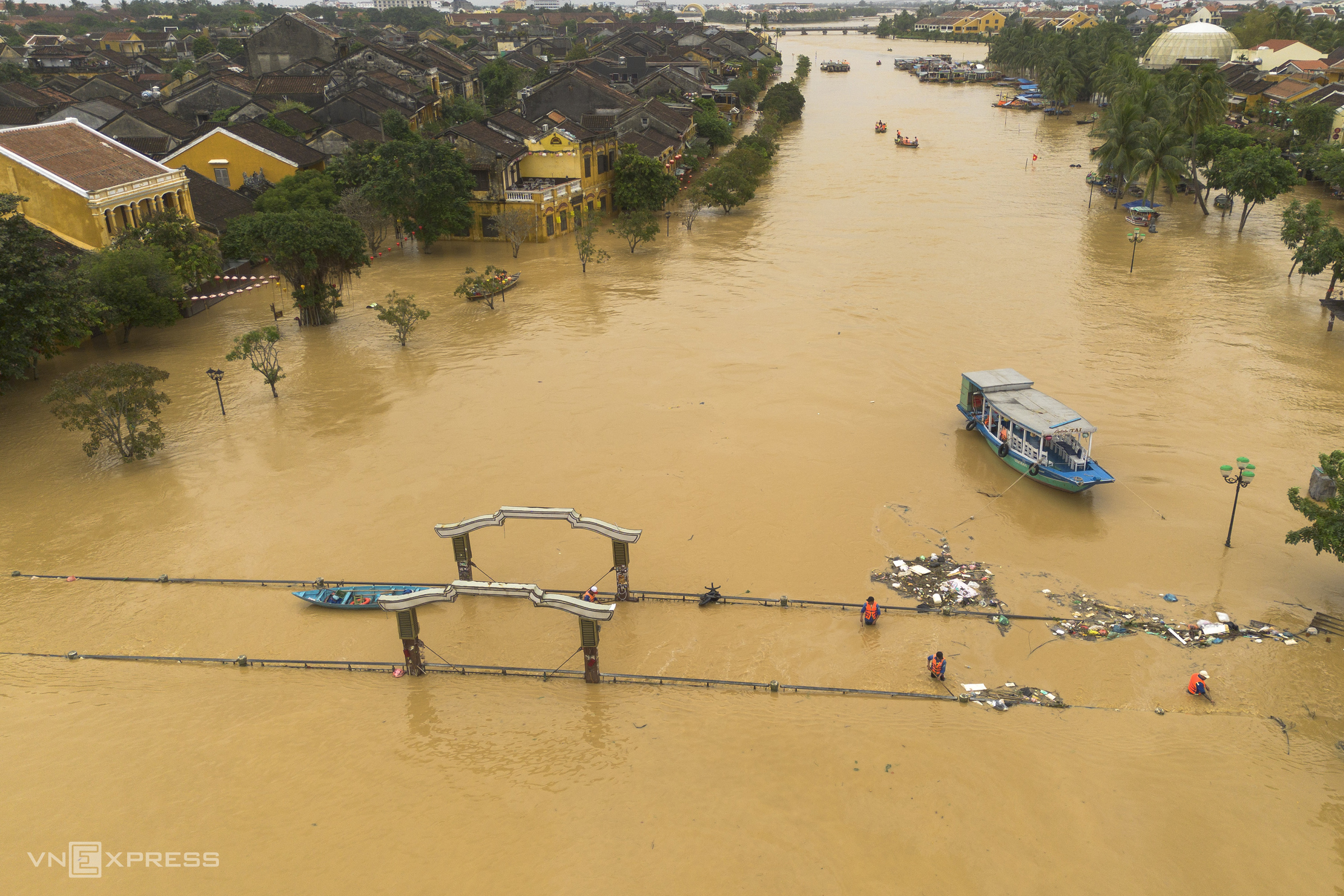 An Hoi bridge, which connects the ancient town with Nguyen Hoang night market across the Hoai river, turned into a river itself. Environmental workers waded waist-deep to collect trash and clear the flow, aiming to help the floodwaters drain faster into Cua Dai beach.