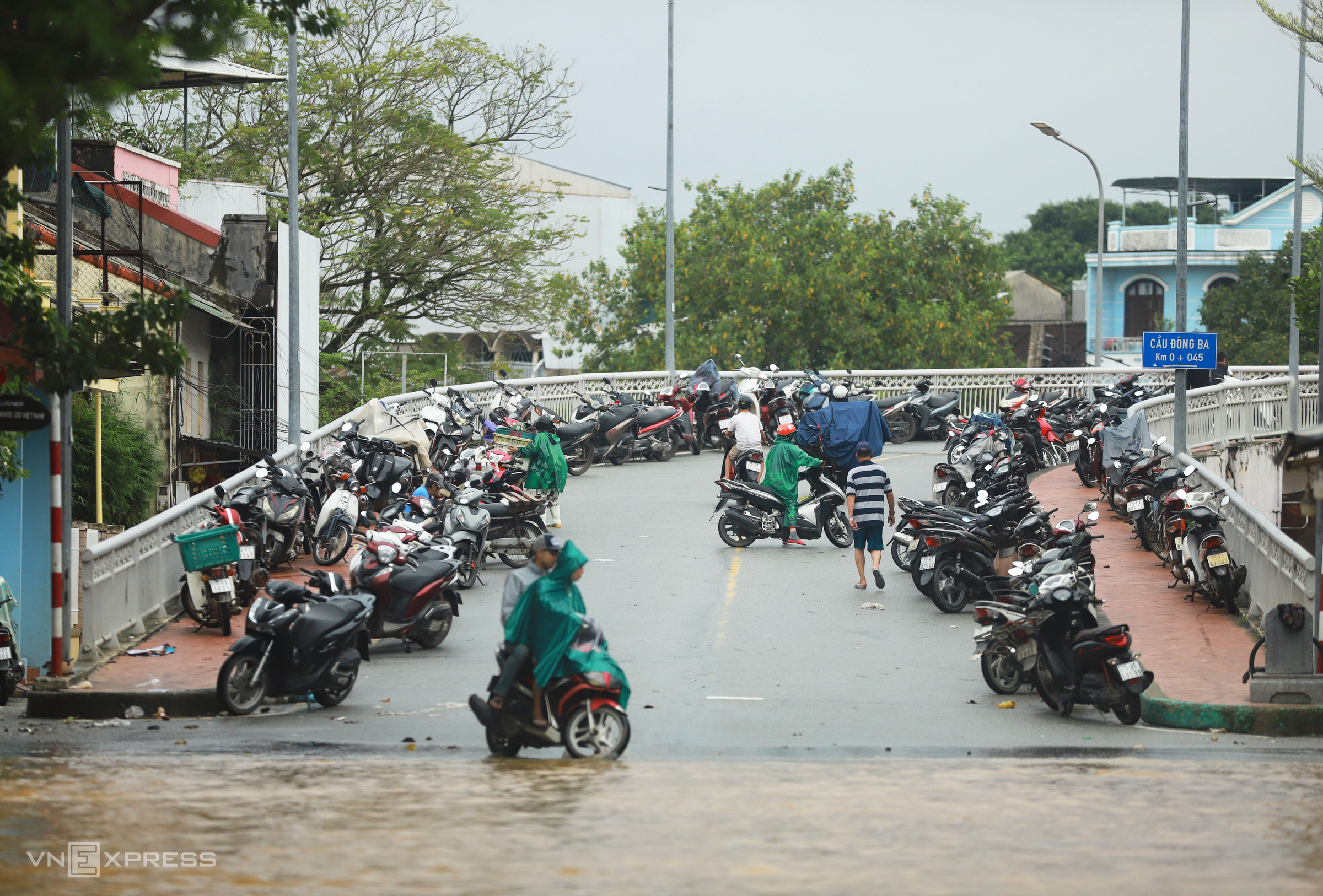 Ron, a resident of Phu Xuan ward, helped his relatives move their vehicles onto Dong Ba bridge to avoid the floods. He stated that during the recent flood, several of his family's motorbikes were submerged, costing one million dong in repairs afterward. |