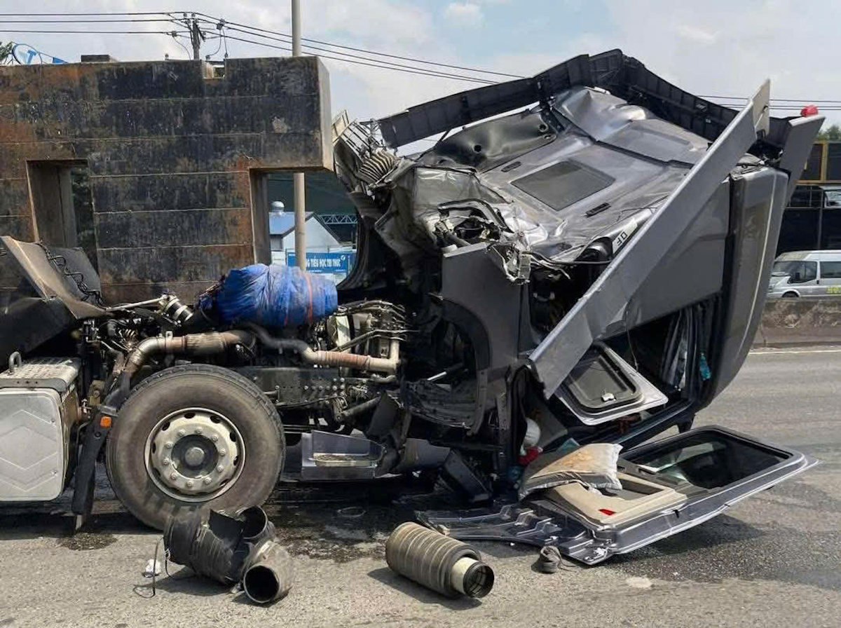 The tractor-trailer cabin was completely crushed. Photo: Thai Ha |