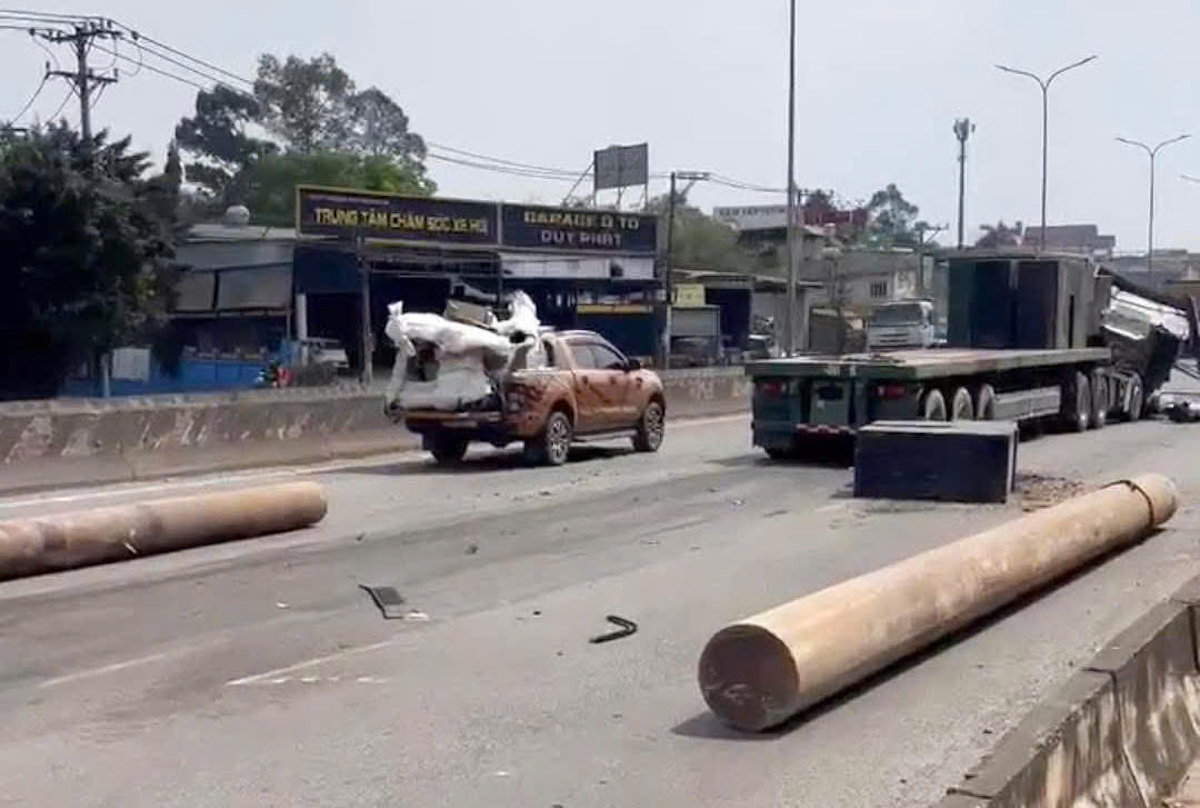 Around 12h, a tractor-trailer transporting multiple square iron containers was traveling on national highway 51, heading from TP HCM towards Dong Nai. As it reached the Loc An intersection in Long Thanh ward, the driver applied the brakes suddenly. This abrupt stop caused the rear iron containers to snap their restraints and slide forcefully forward due to inertia.