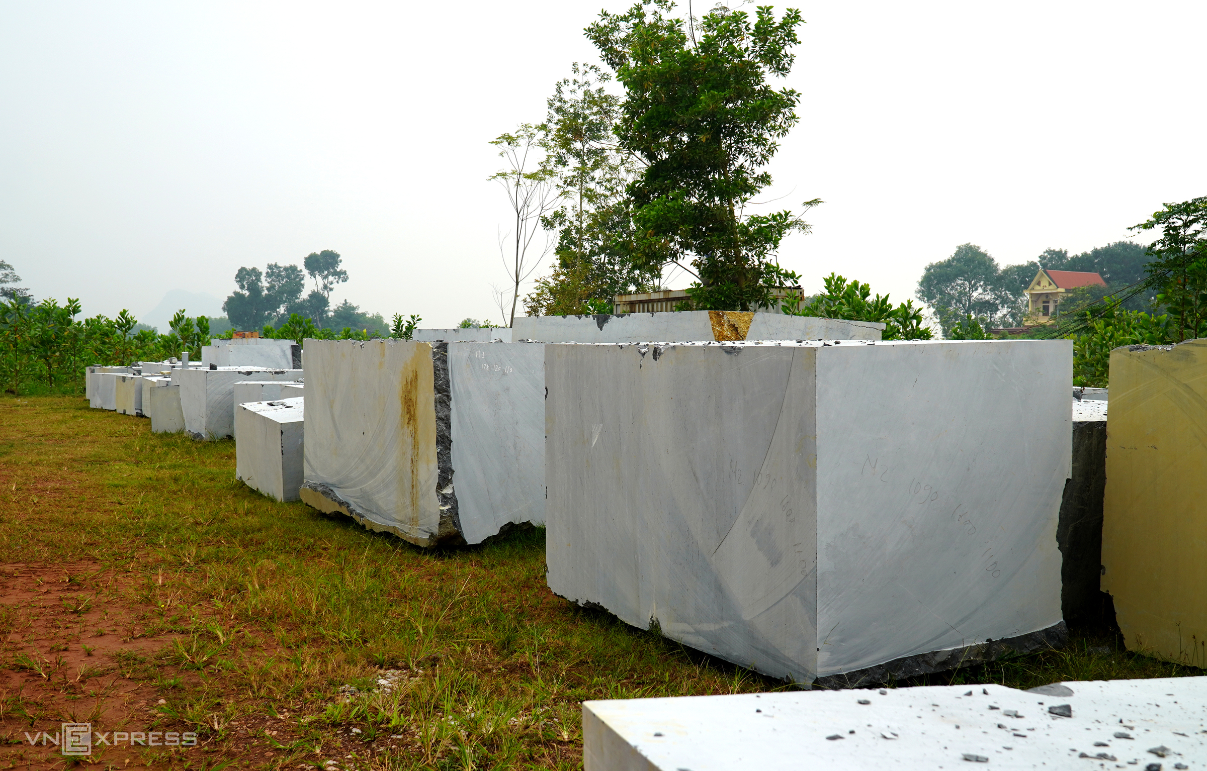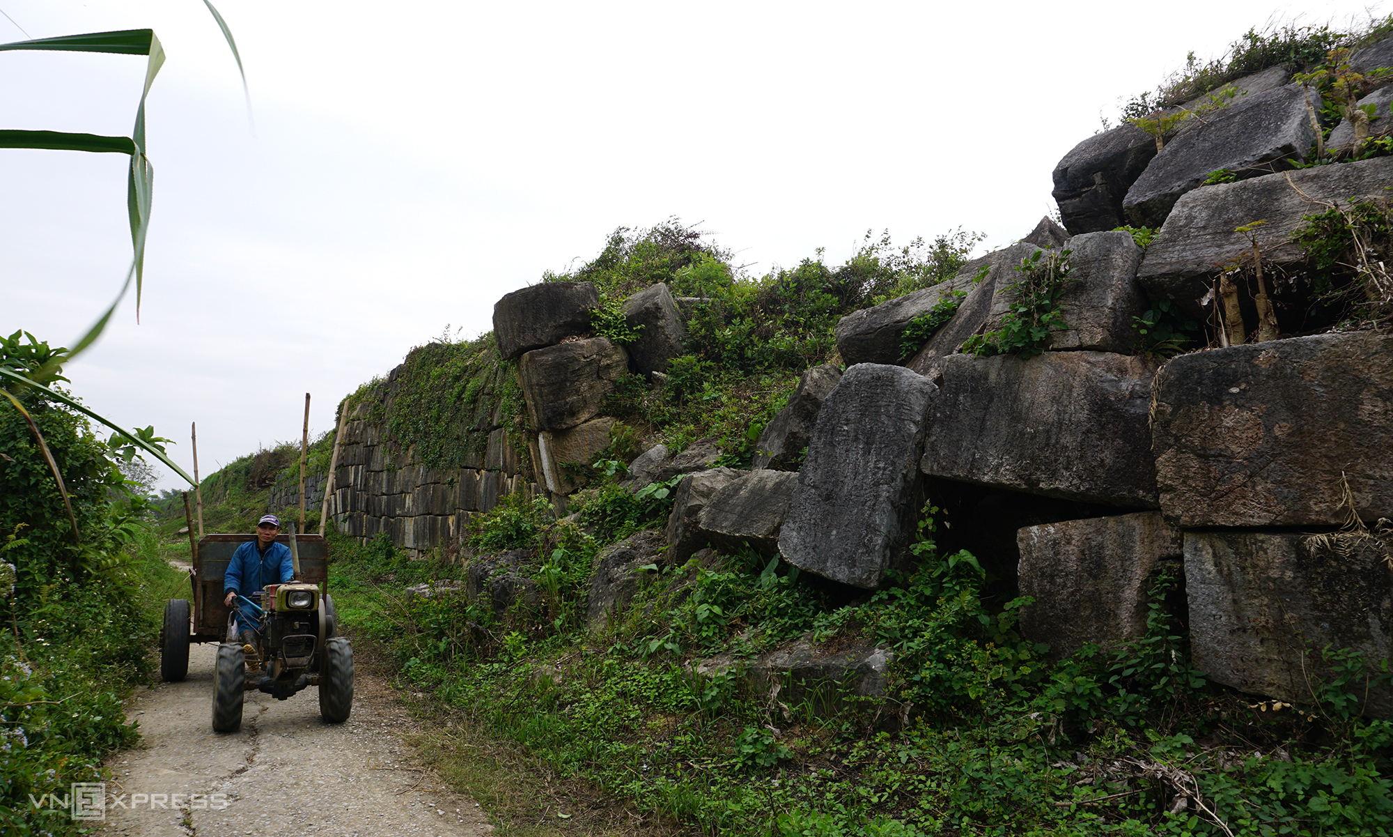 At the restoration site, the contractor has gathered many large stone slabs, some weighing 5-7 tons, for wall repair. These are monolithic green stones, believed to be of the same type as those quarried from local mountains to build the Ho Citadel in the 14th century.