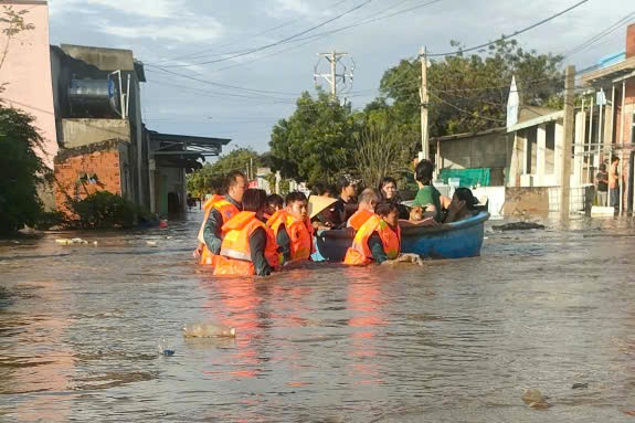 Authorities evacuate residents in Phuoc The village, Lien Huong commune from the flooded area this morning. *Photo: Long Huong*