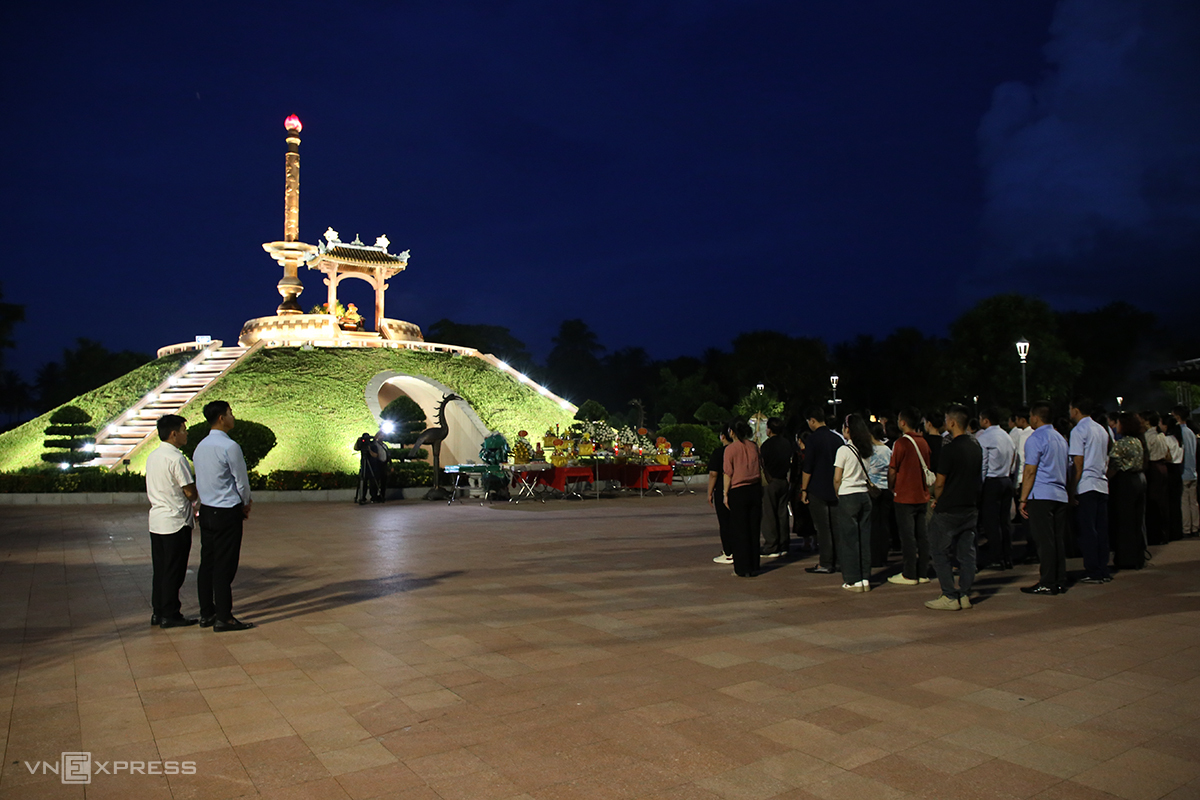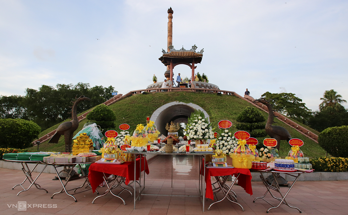The ceremony began at 6:15 p.m. in front of the memorial monument in the center of the Quang Tri Citadel relic site, a replica of the mass grave of thousands of soldiers. The offering table was prepared according to Vietnamese tradition, including fruits, chicken, roasted pork, sticky rice, sweet soup, and votive paper offerings. Many individuals and organizations sent flower baskets and fruit baskets to the offering table to express their gratitude.