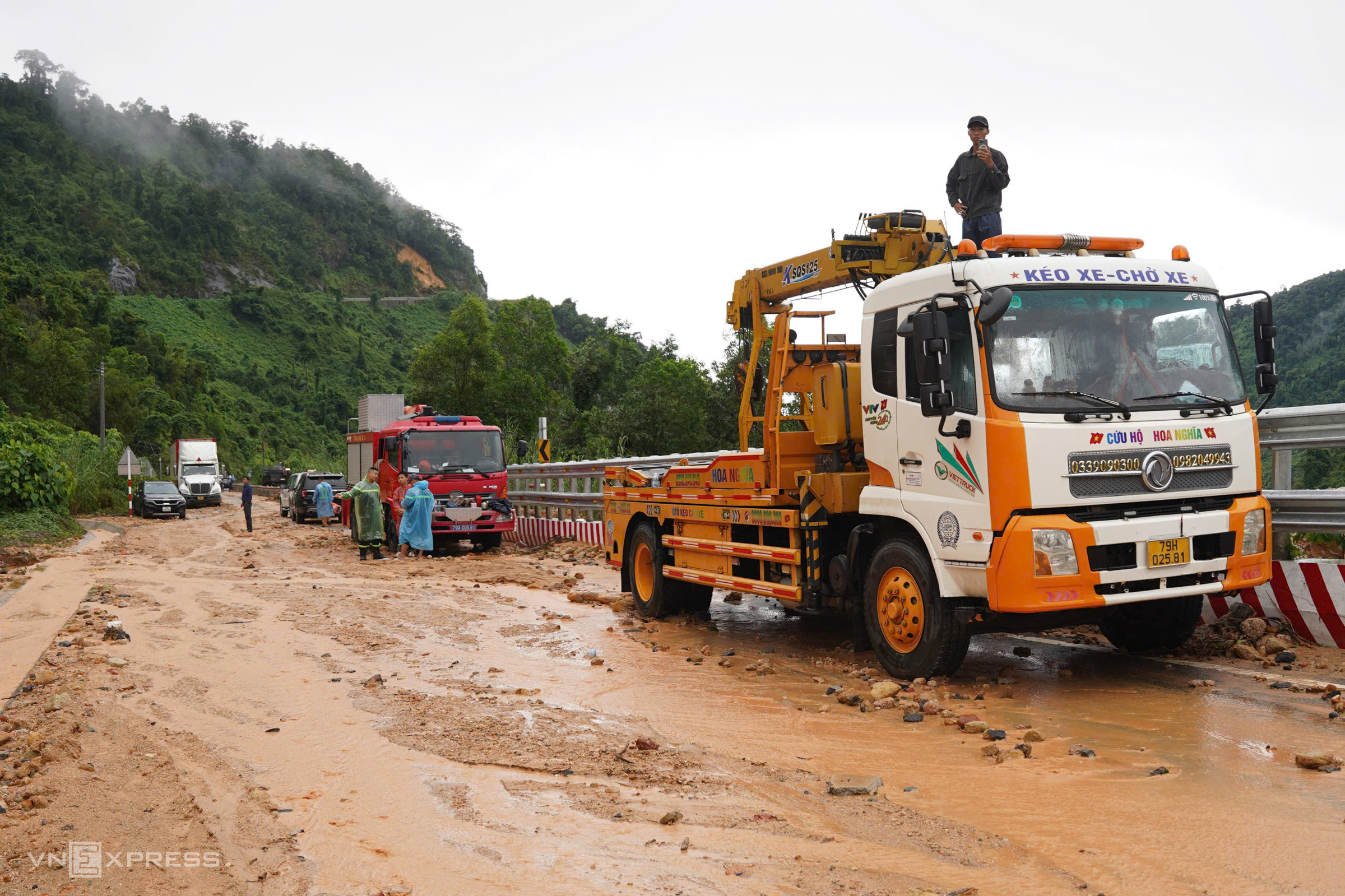 Bulldozers are actively clearing rocks and soil on Khanh Le Pass to facilitate access to the accident scene. Many rescue vehicles are waiting for the road to be cleared before they can reach the site.