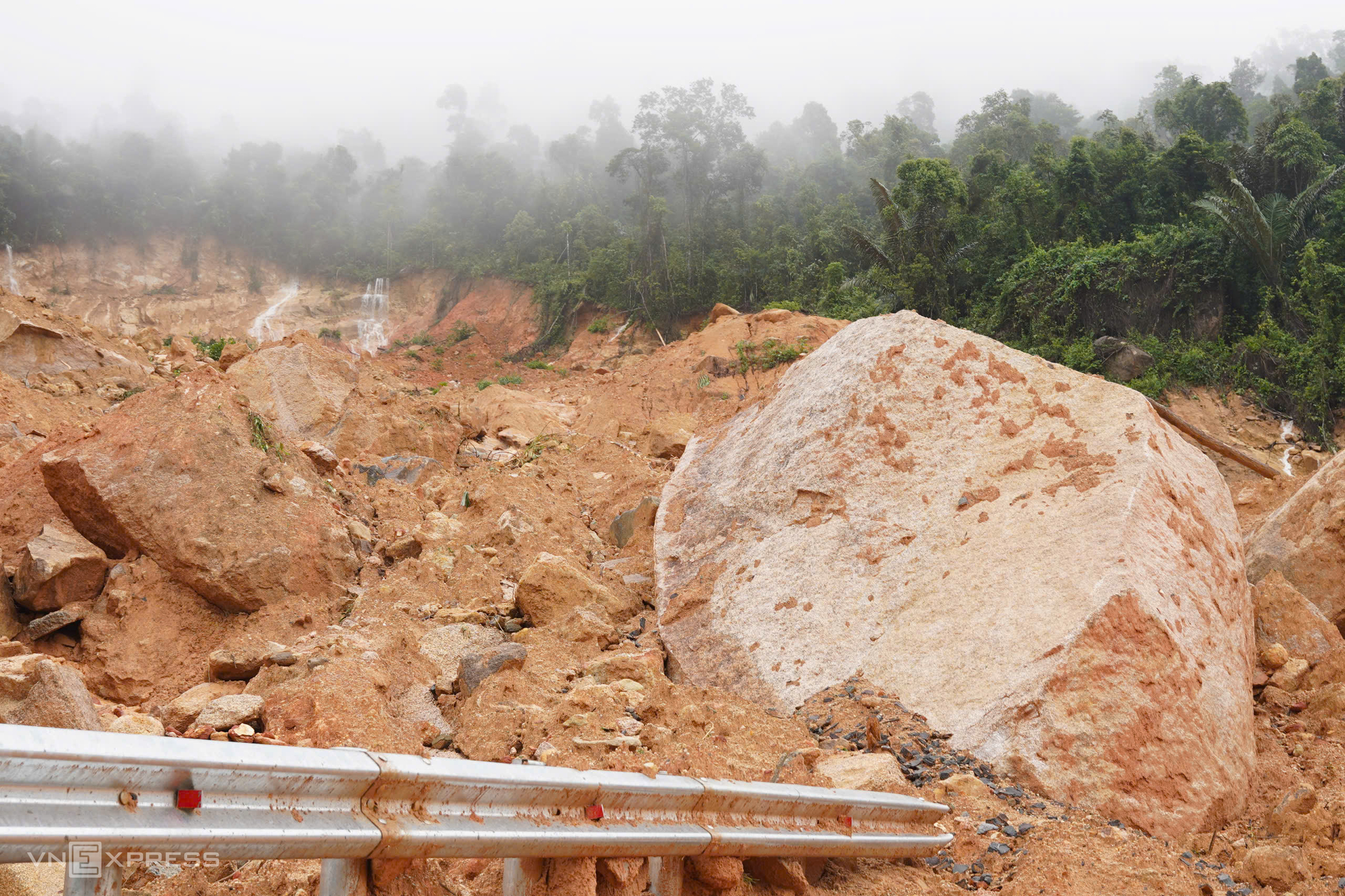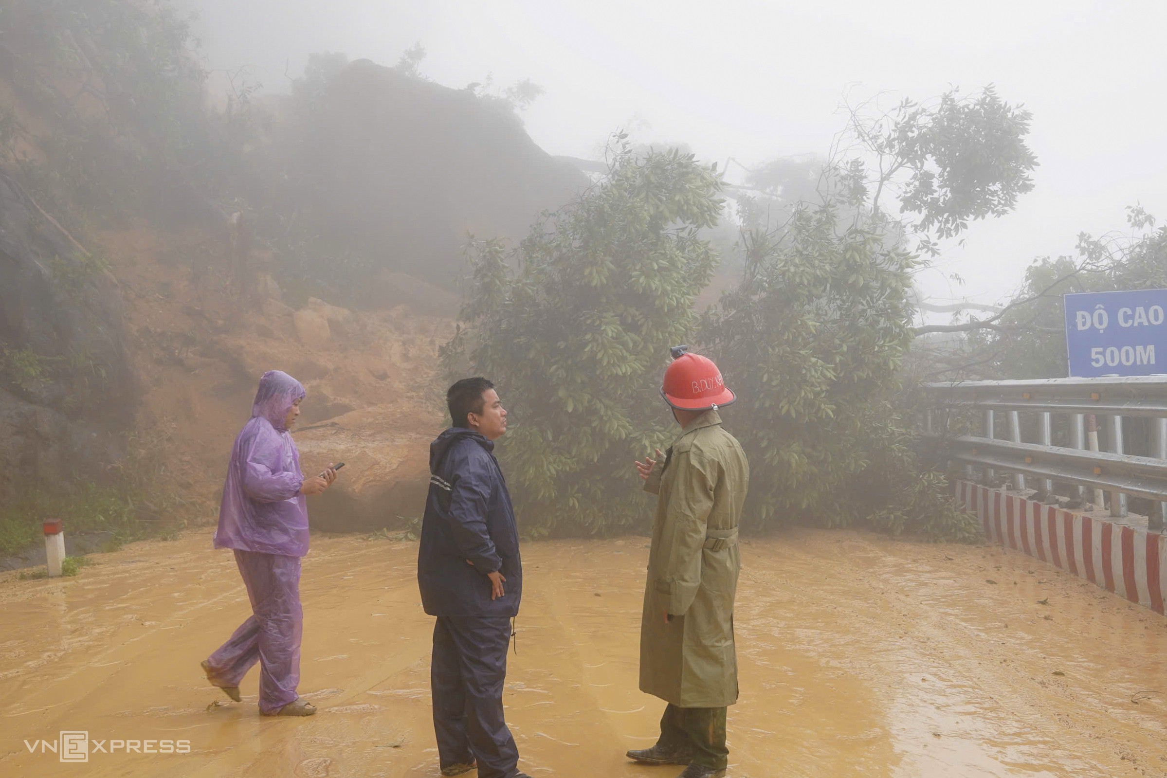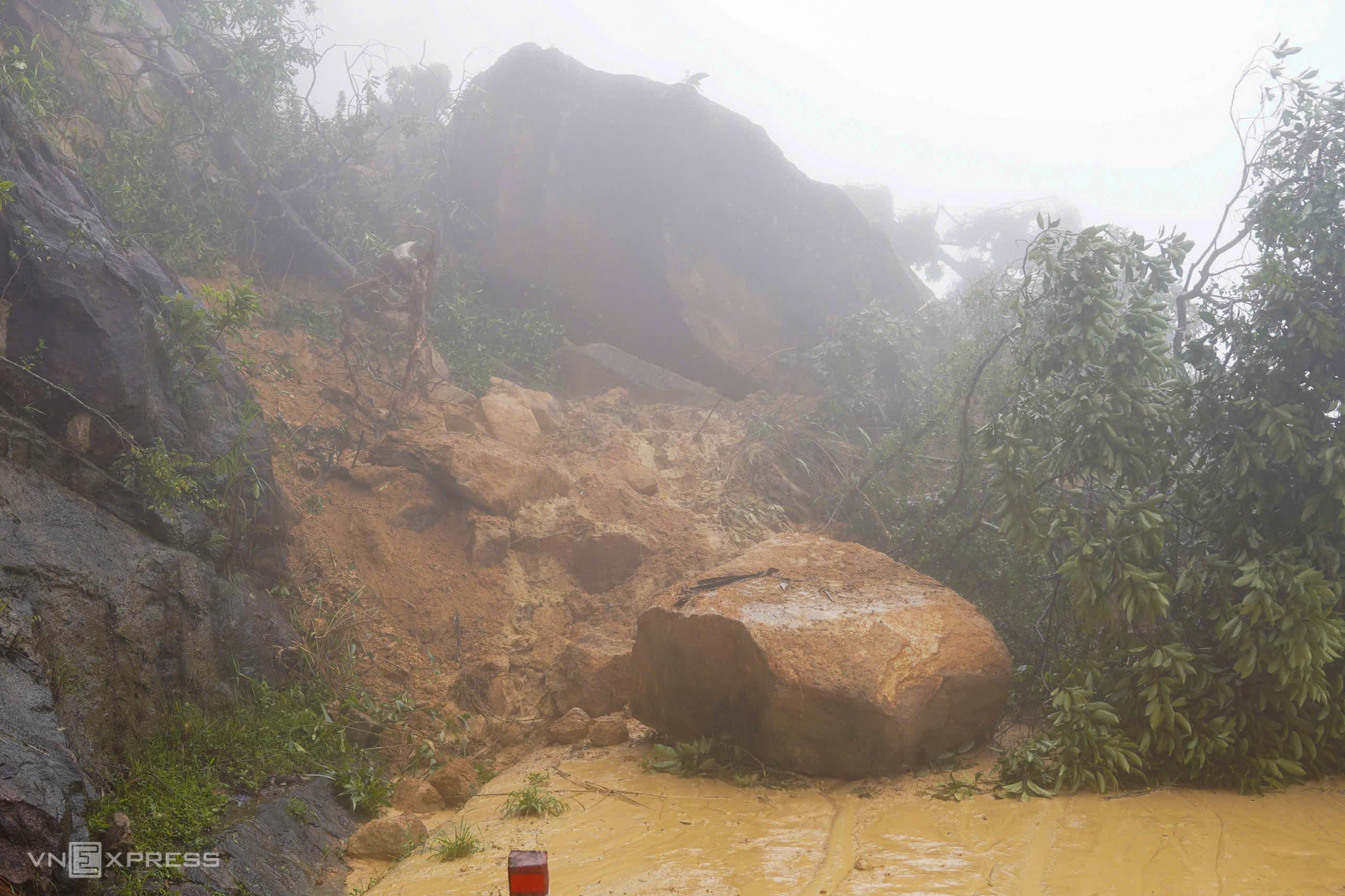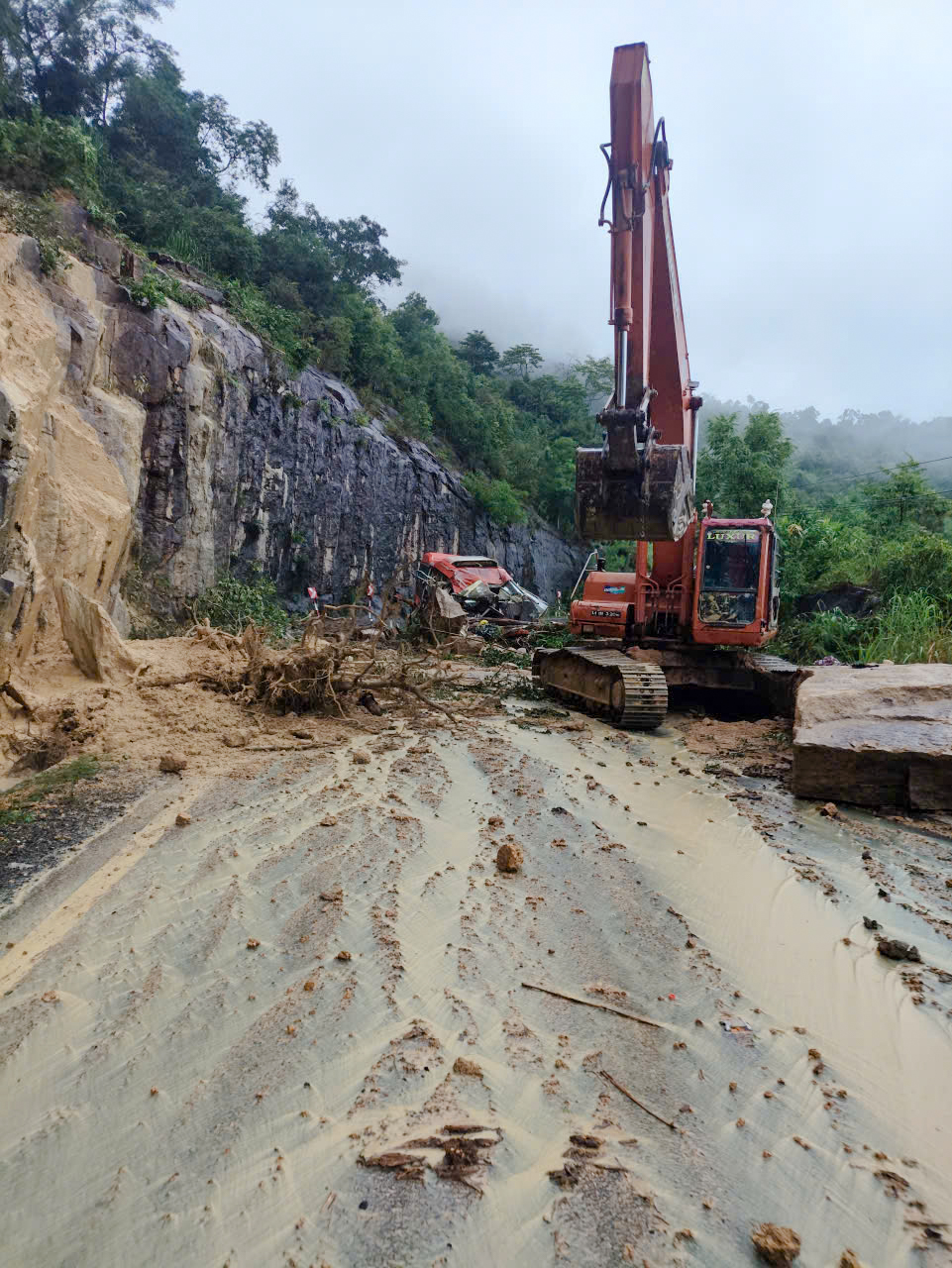 A third landslide point on Khanh Le Pass, approximately three kilometers from the accident site, where authorities are mobilizing excavators to clear the road. |
