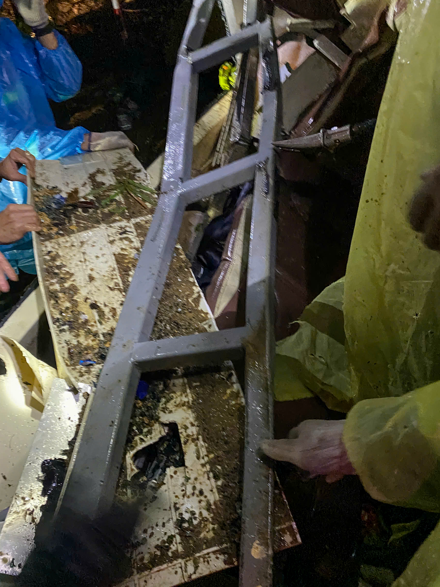 A section of the vehicle's body frame was bent by rocks and soil after the accident. |