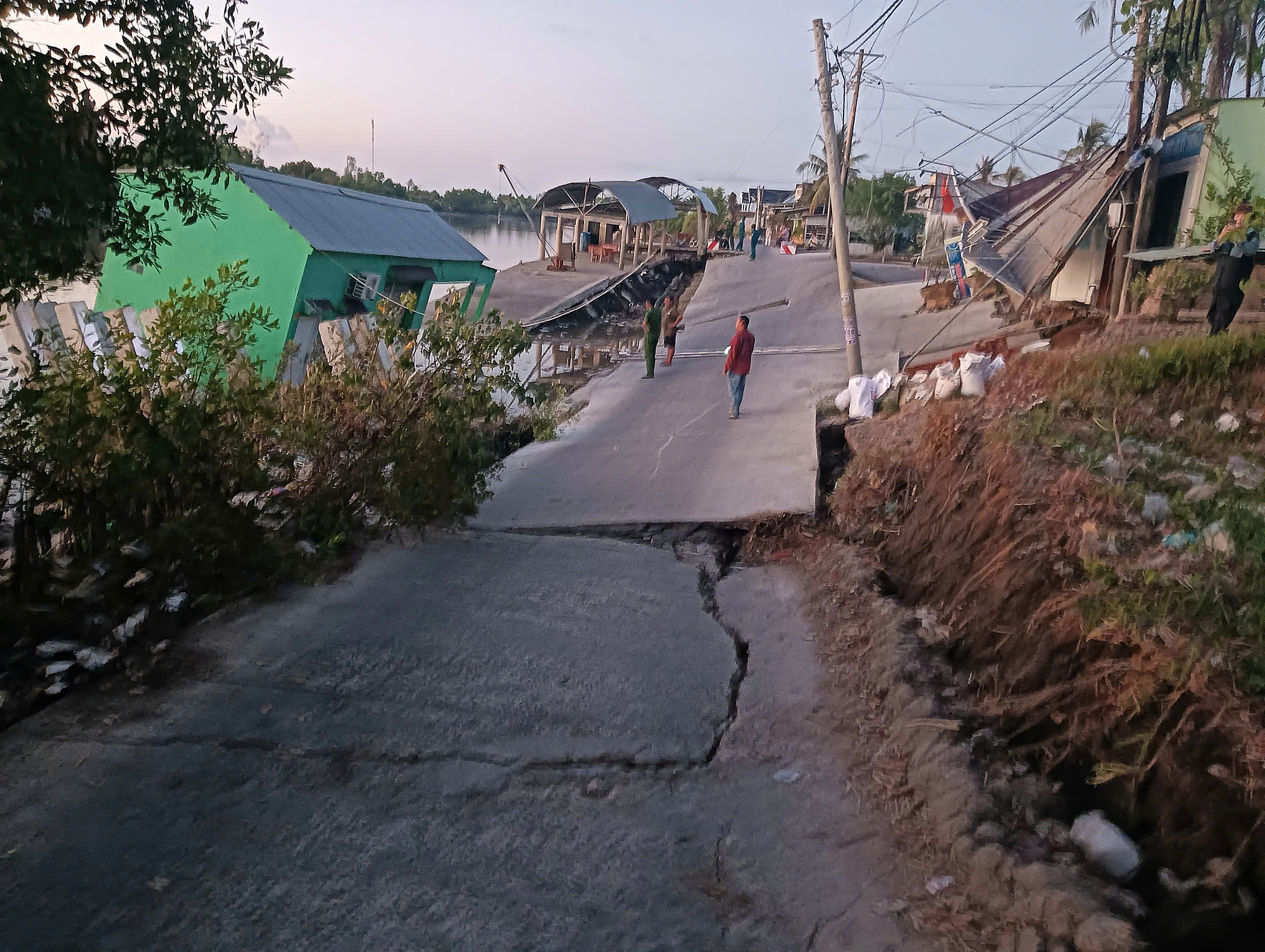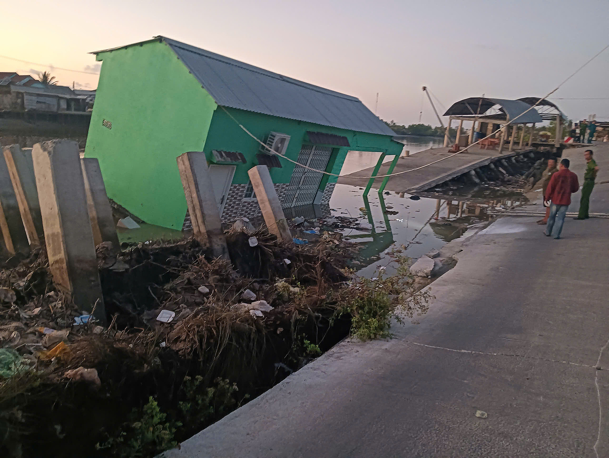Ca Mau has experienced several landslides recently. Most recently, on 21/4, a landslide occurred along the Cong Chua road (Tan Thanh ward), extending about 30 meters and eroding over 12 meters deep. This affected six homes: four completely collapsed, and two were deemed dangerous, requiring evacuation, with damages estimated at 900 million VND.