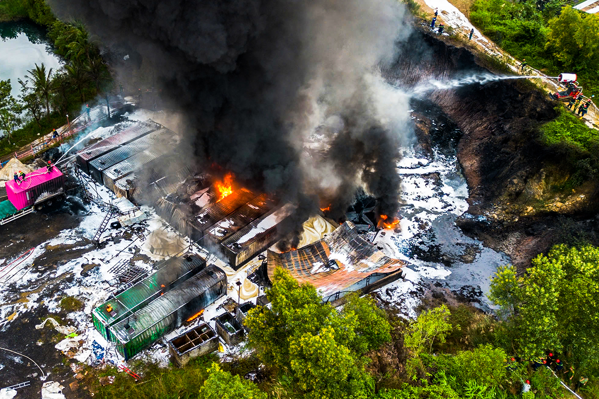The Da Nang Fire Prevention, Fighting, and Rescue Police mobilized 10 specialized vehicles, including a firefighting robot, and dozens of officers to the scene. The fire engulfed hundreds of square meters, with high temperatures, dense smoke, and the risk of explosions from fuel tanks, making access challenging.