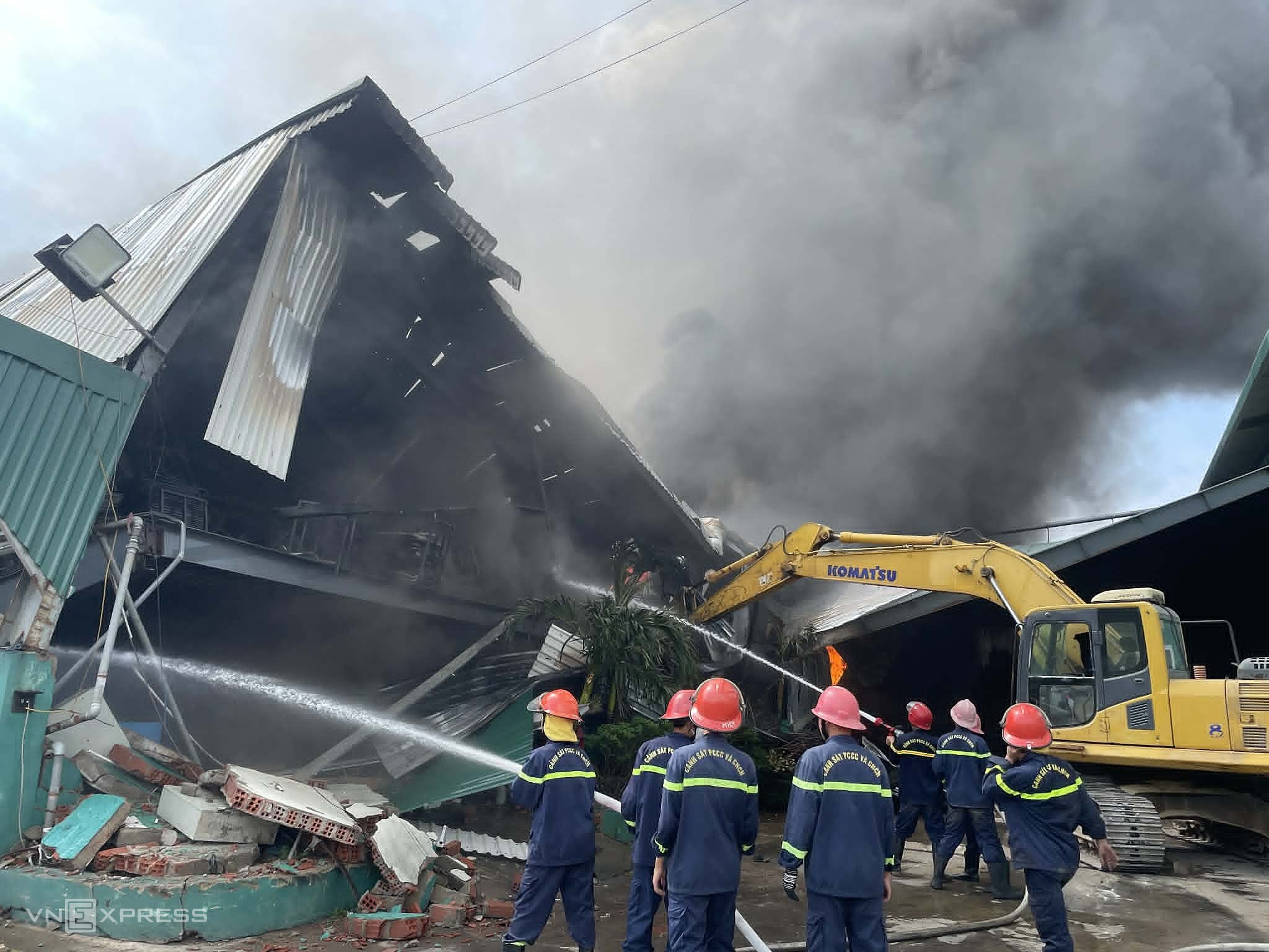 A crane clearing a path for firefighting operations. *Tran Hoa*