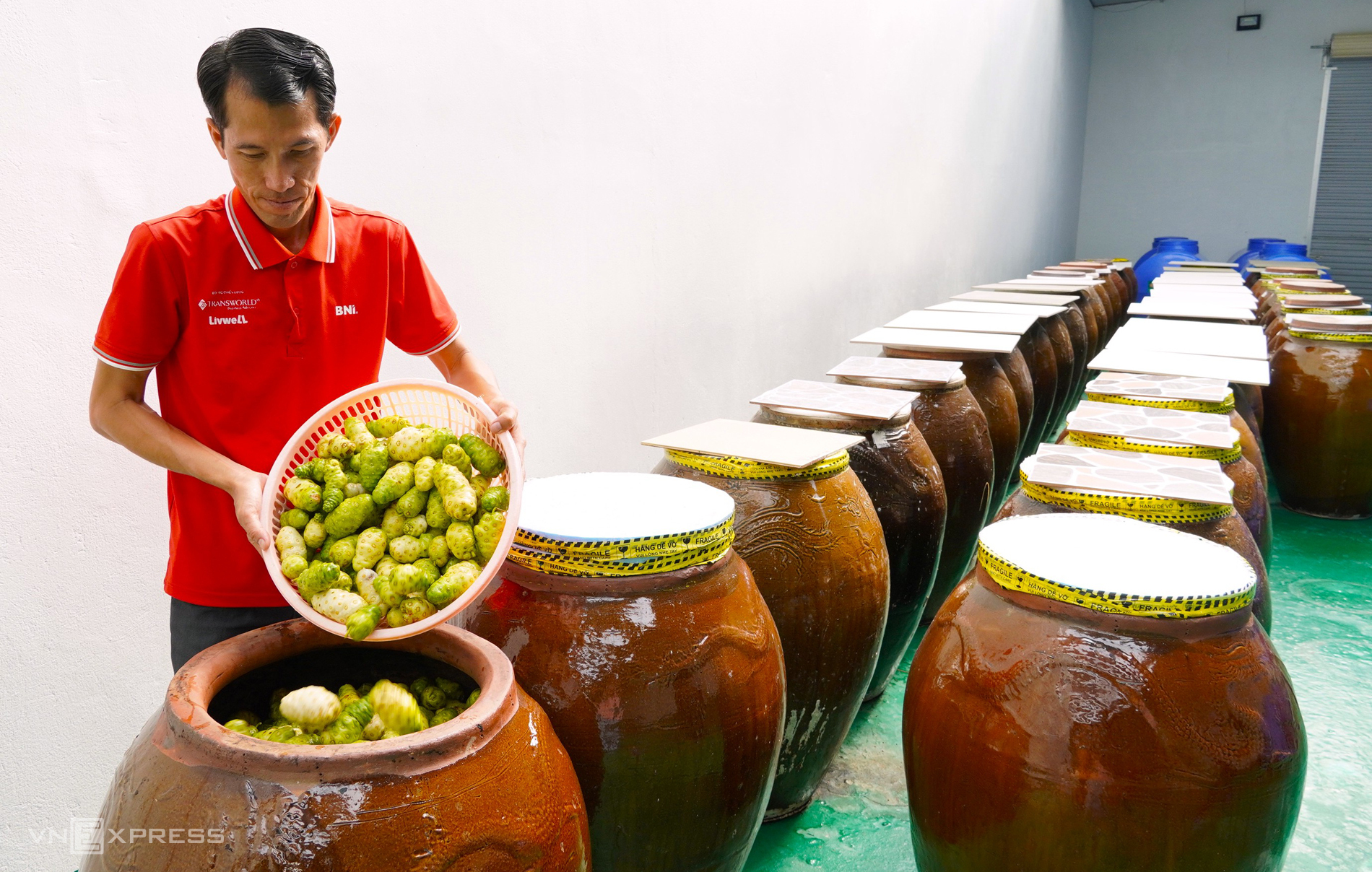 After the fermentation period, the noni gradually changes color before being transferred to a machine that separates the liquid from the seeds, yielding the concentrate for various product lines. According to Chuong, noni juice concentrate is well-known in countries like the United States and Australia. This product is recognized as a "superfood" that improves and enhances health, boosting immunity. Notably, Iridoids found in noni fruit have anti-cancer and anti-cell mutation properties.