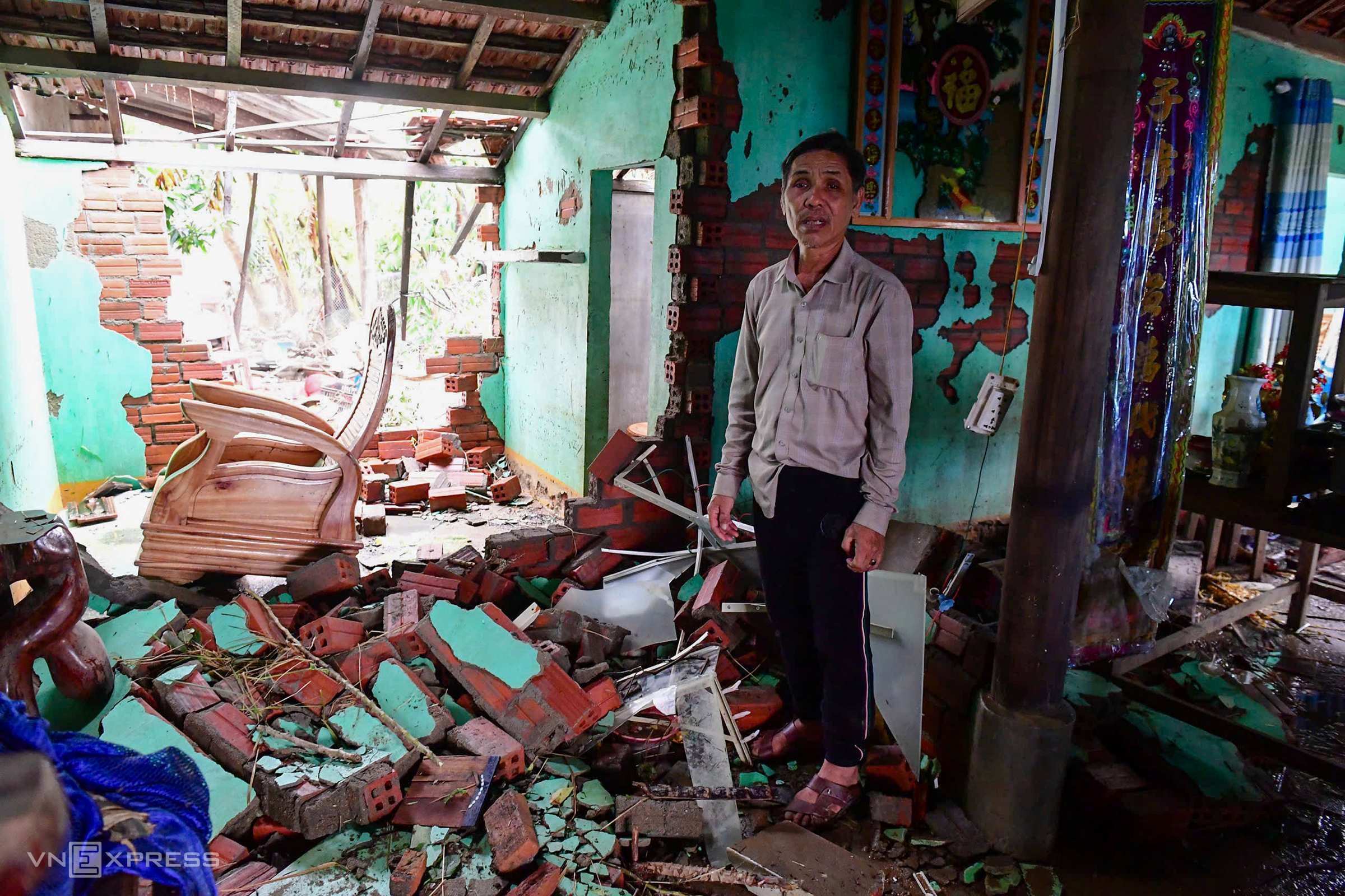 Nguyen Van Bo, residing in My Trung village, Hoa Thinh commune (formerly Phu Yen, now Dak Lak), stands in his collapsed home after floodwaters receded. Photo: Thanh Tung |