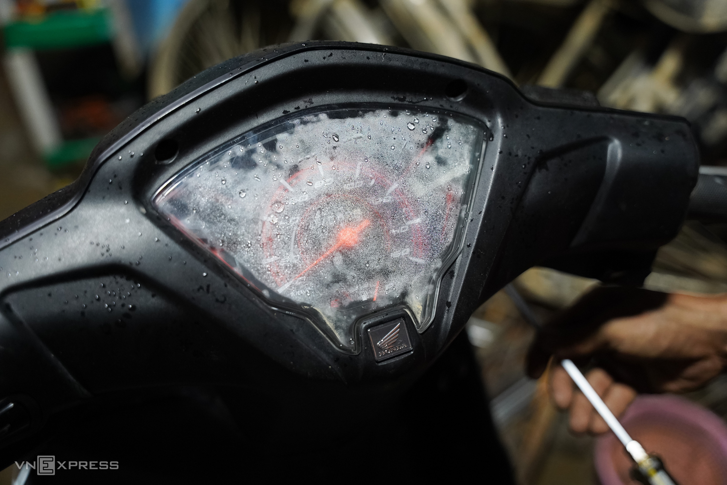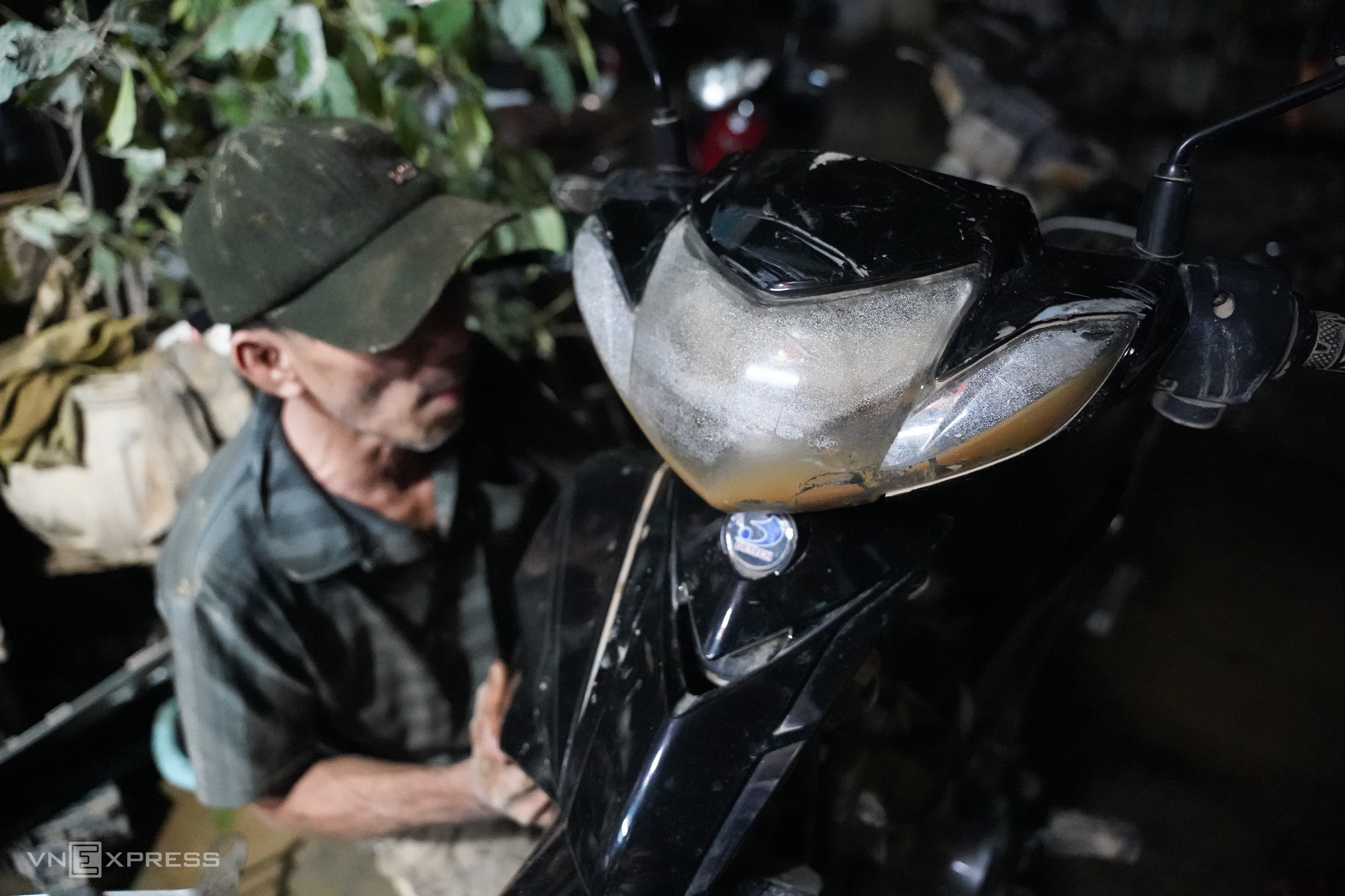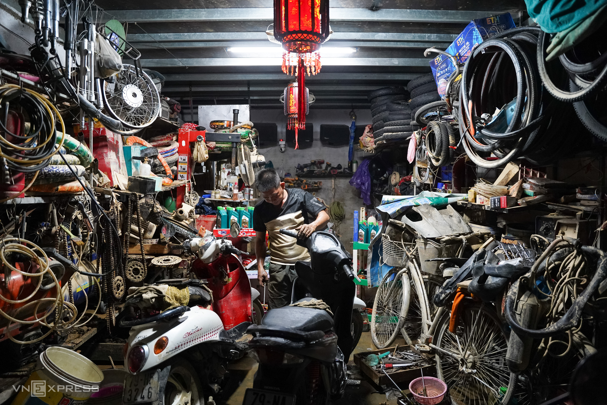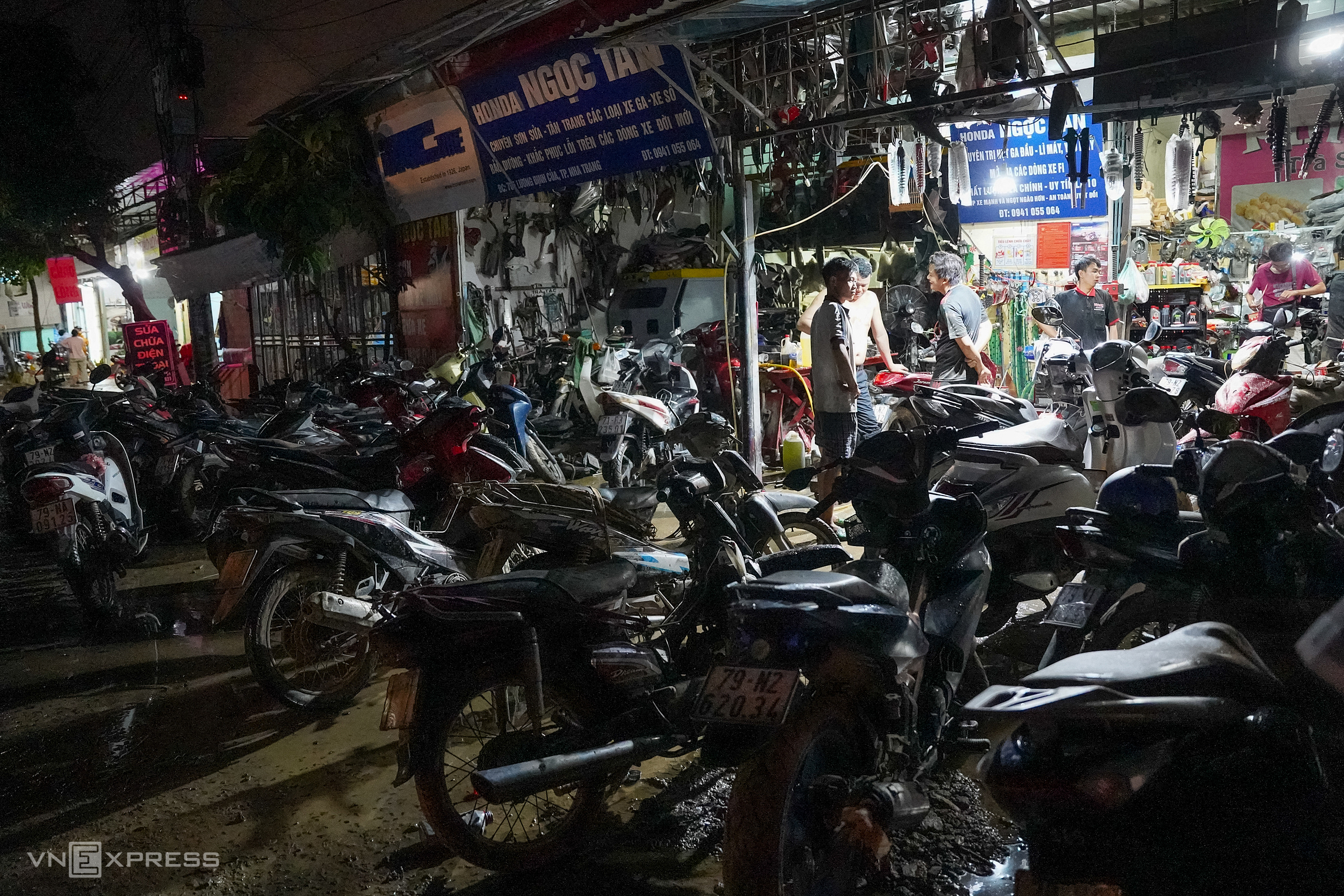 Approximately 500 meters from Thach's shop, Ngoc Tan's garage still had dozens of motorbikes awaiting service by 20h. He explained that many vehicles lacked replacement parts, requiring customers to wait another two to three days.