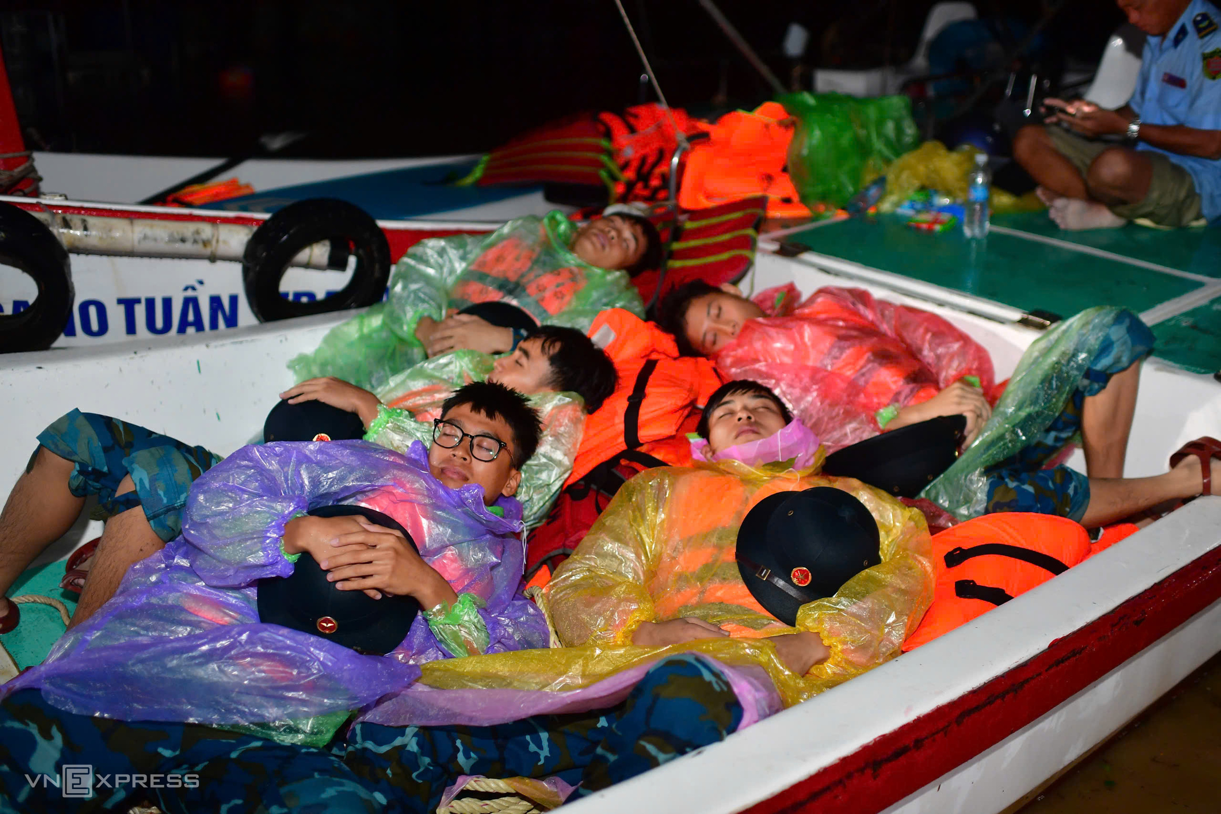 By midnight, many soldiers, wearing raincoats, slept on boats after a strenuous day of rescue.