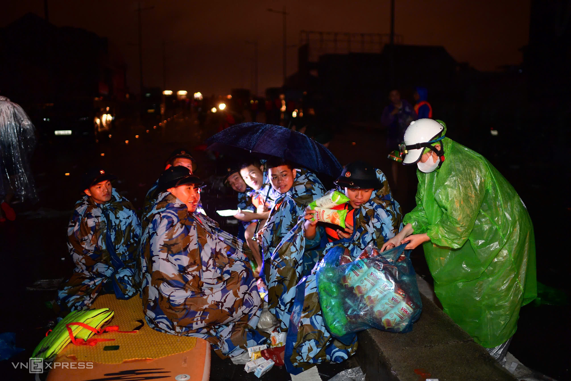 Soldiers took a quick dinner break after a day of rescue operations in the flooded Nha Trang ward.