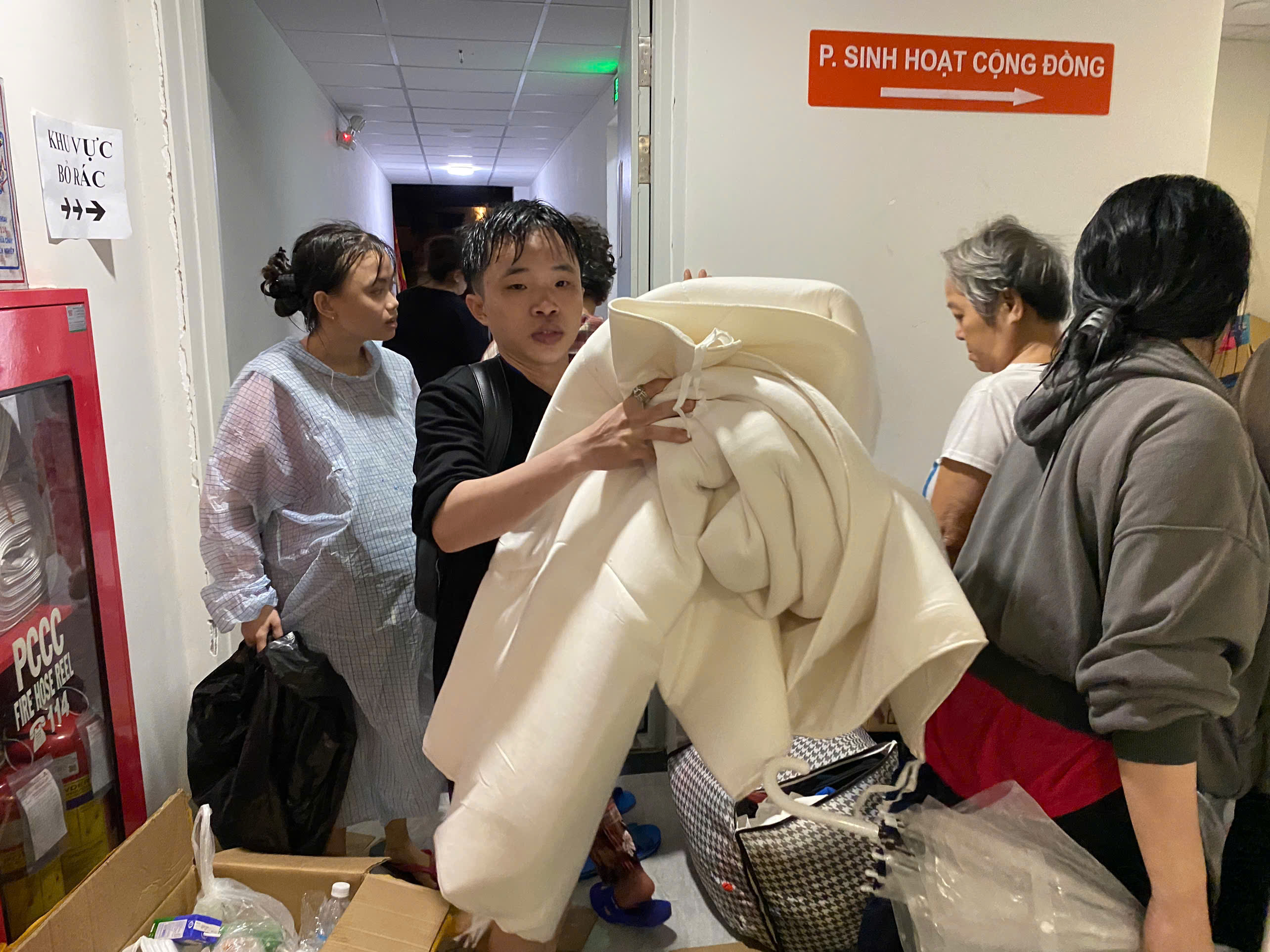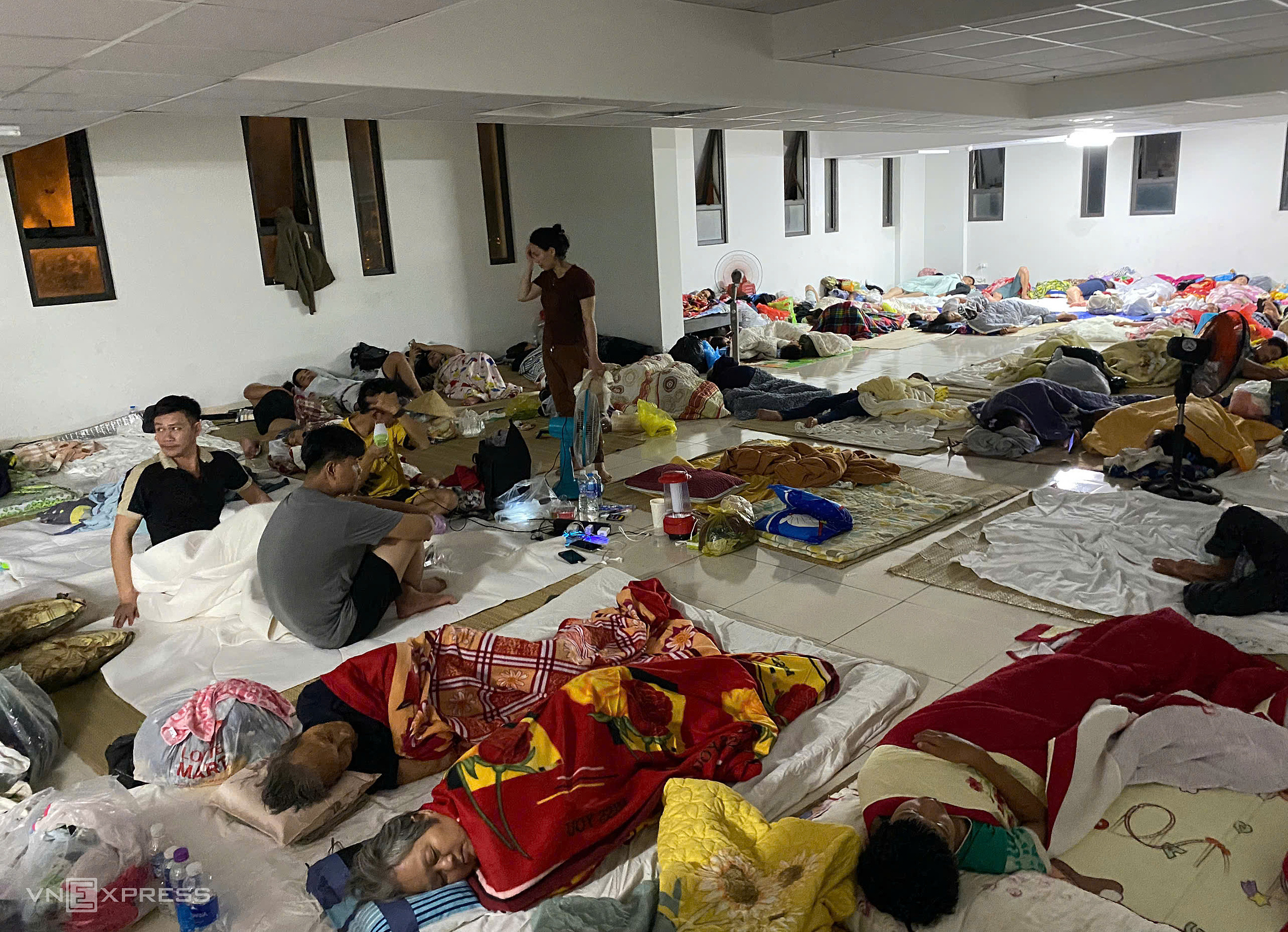 About 3 km from the flooded area, the second floor of a social housing apartment building in Nam Nha Trang ward, with a spacious 500 square meter hall, served as a shelter for over 200 people. They received free meals, clothes, and medicine, but after a day of fleeing the floods, most lay sprawled, exhausted. |