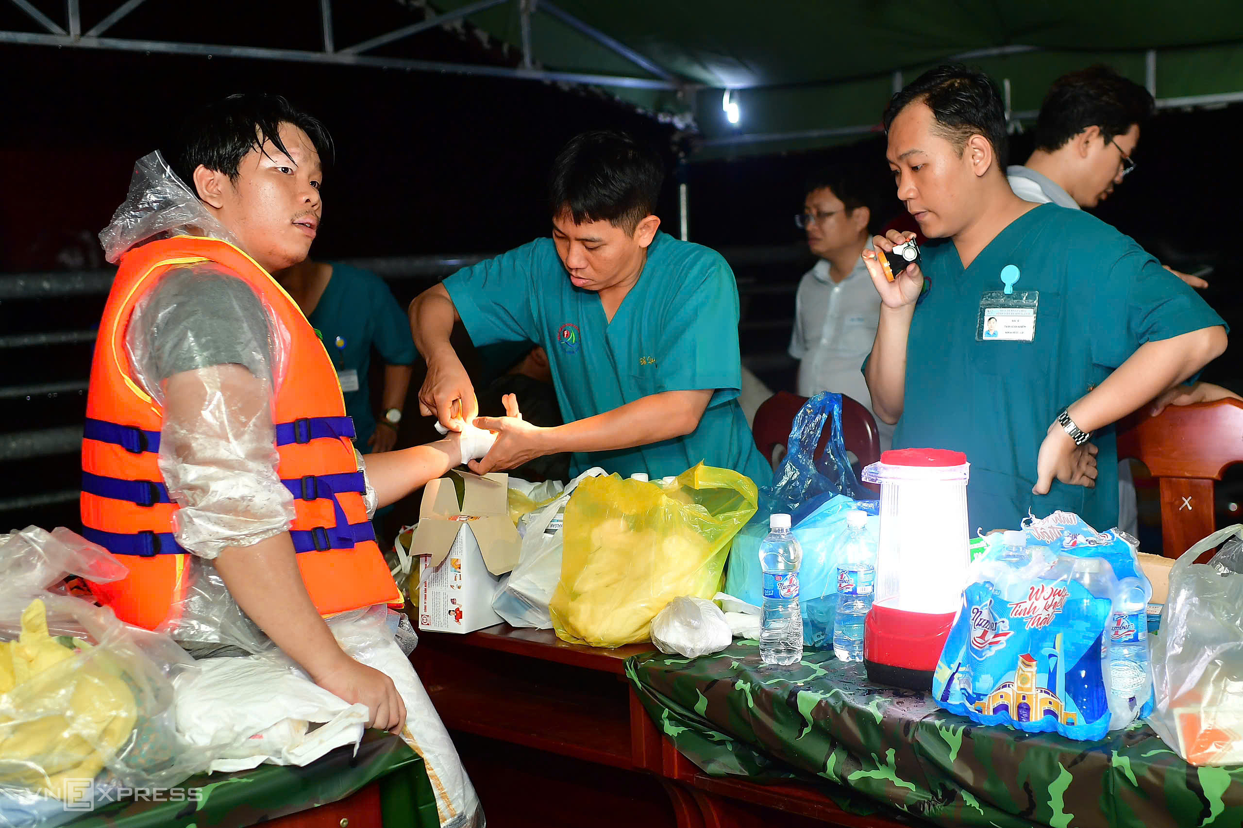 Medical personnel assisted in bandaging the wounds of an injured person who had just left a flooded area. |