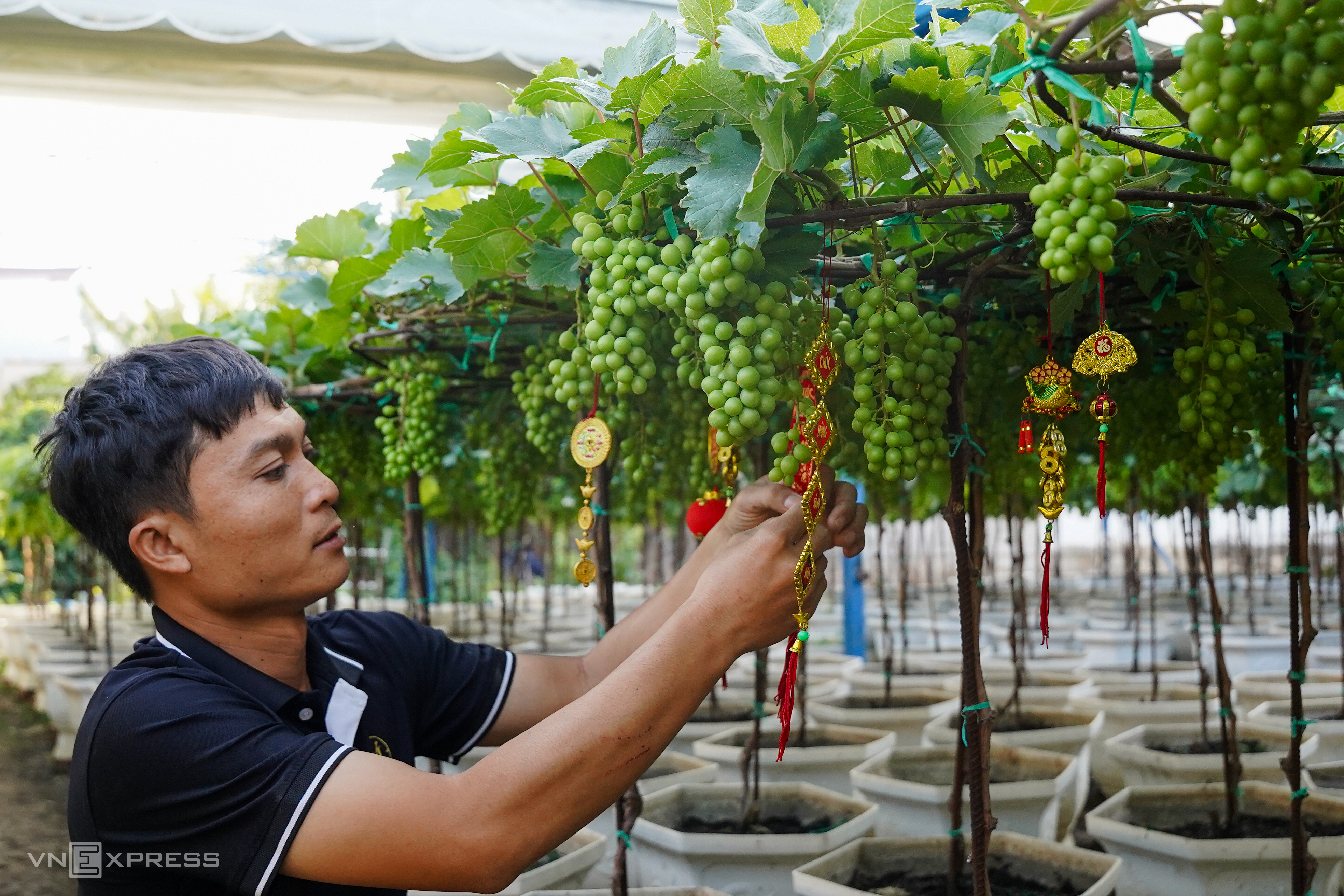 Mr. Tong Minh Hoang, owner of a large ornamental grape garden in Ninh Phuoc commune, is inspecting 300 pots he cultivated months ago; most are ready for sale this Tet holiday.
