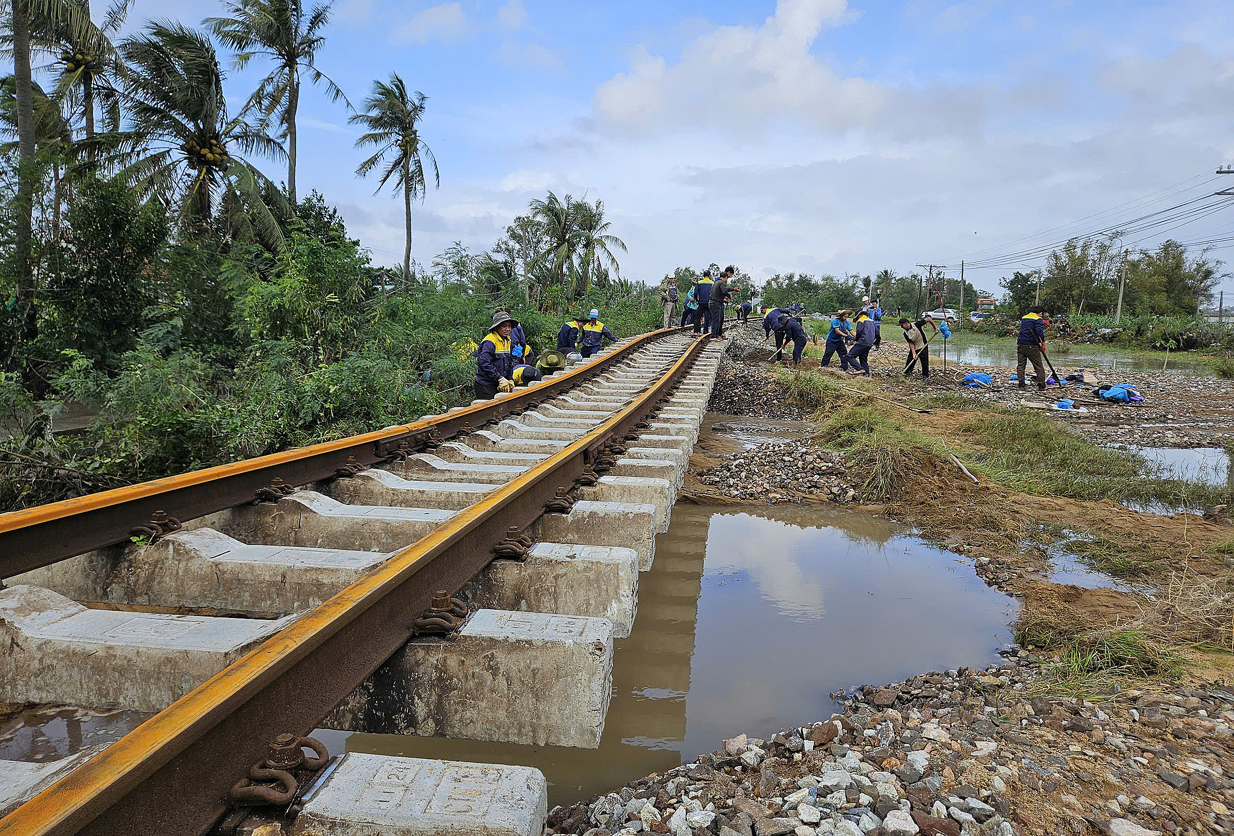 To expedite repairs, the railway sector mobilized three construction teams from Thuan Hai, Nghia Binh, Thanh Hoa, and Phu Khanh Railway Joint Stock Companies, deploying 800 workers to the damaged sections. Crews undertook extensive reinforcement of eroded sections. On 24/11, units also cleared the Hao Son - Phu Hiep section.