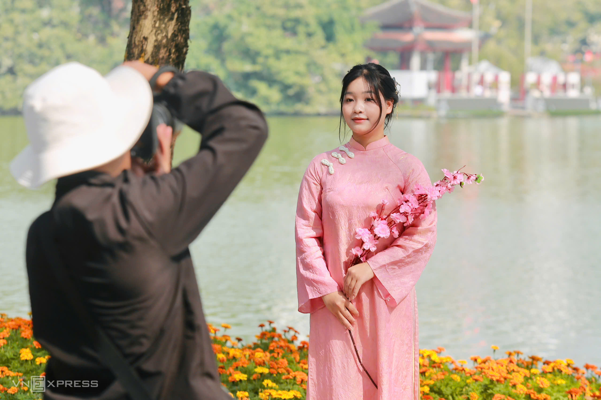 A young woman takes photos at Ho Guom during sunny weather on 20/12. Photo by Gia Chinh |