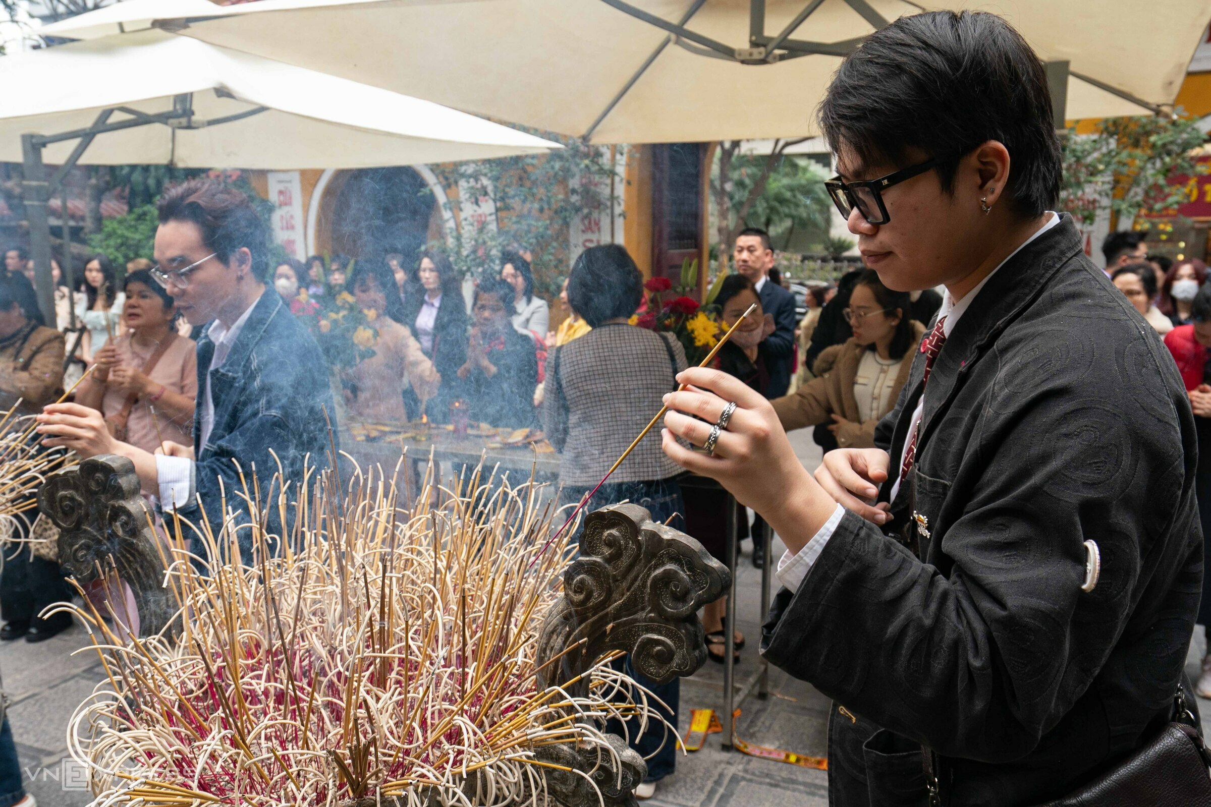 Pham Dinh Nam, 23, from Dan Phuong commune, explained that his company held its year-end party in the morning, with each department sending representatives to offer incense and prayers for wealth and health. This marks Nam's first time visiting a pagoda with his company. In addition to Chua Quan Su, his company's group also visited two other temples and pagodas in Hanoi.