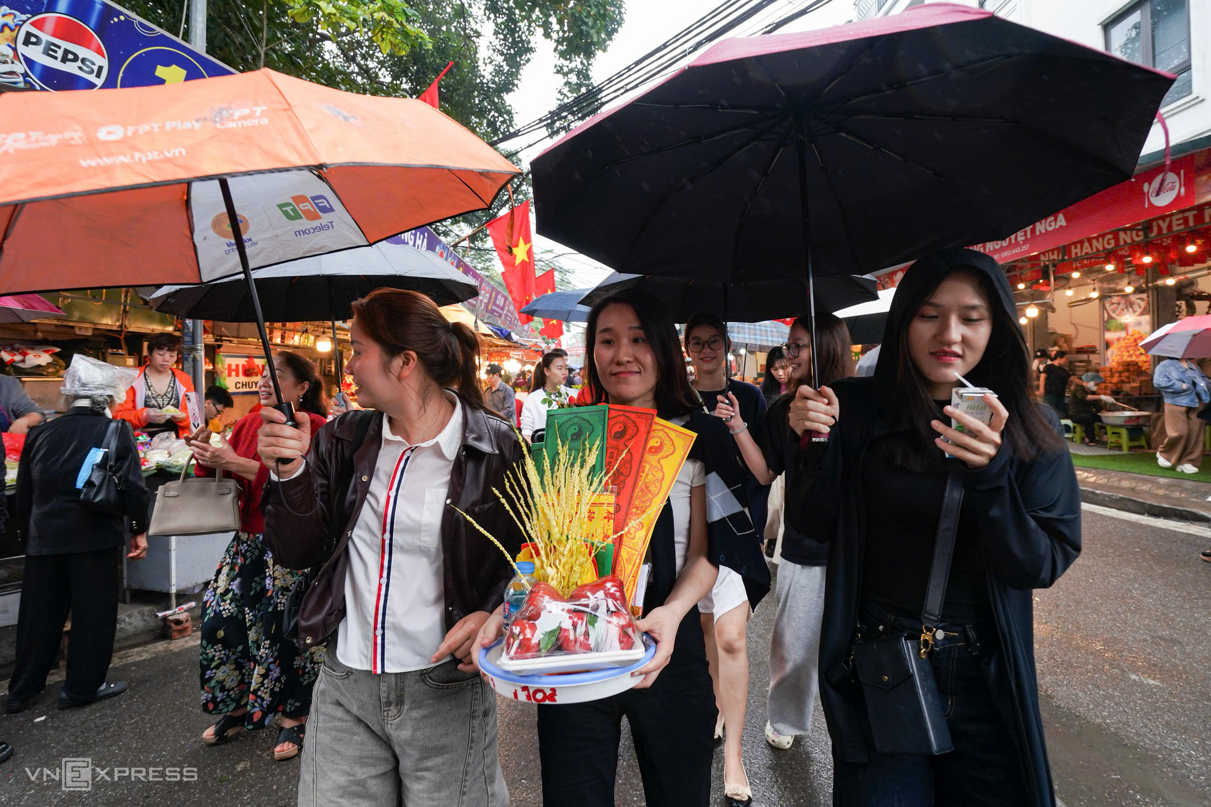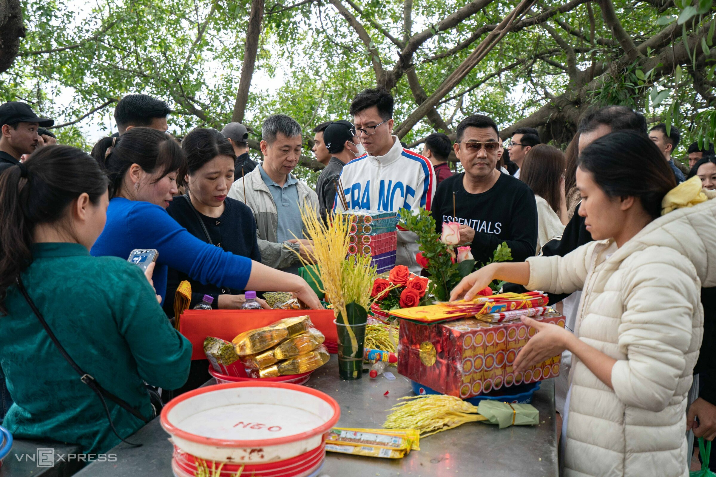 Each offering tray costs between 200,000 and 300,000 VND, typically including votive paper money, fresh flowers, and various fruits. Due to the large crowd, individuals making offerings had to carefully arrange their items, carrying trays high above their heads to avoid collisions and spills while moving through the throng.