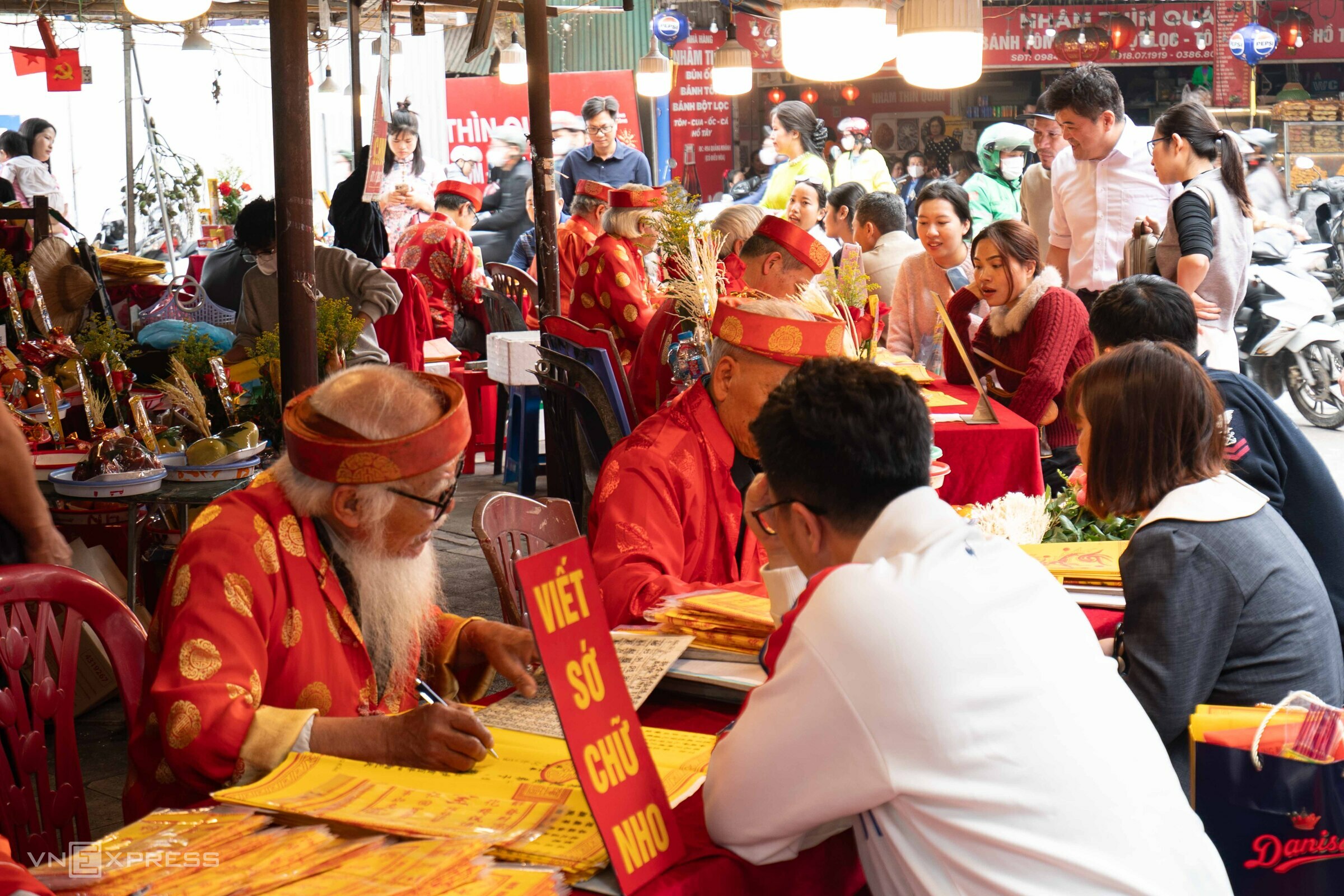 The area where calligraphers write petitions was crowded with visitors at the beginning of the year. Petitions were pre-printed, with the calligraphers adding the petitioner's name and age in Nom script as requested. |