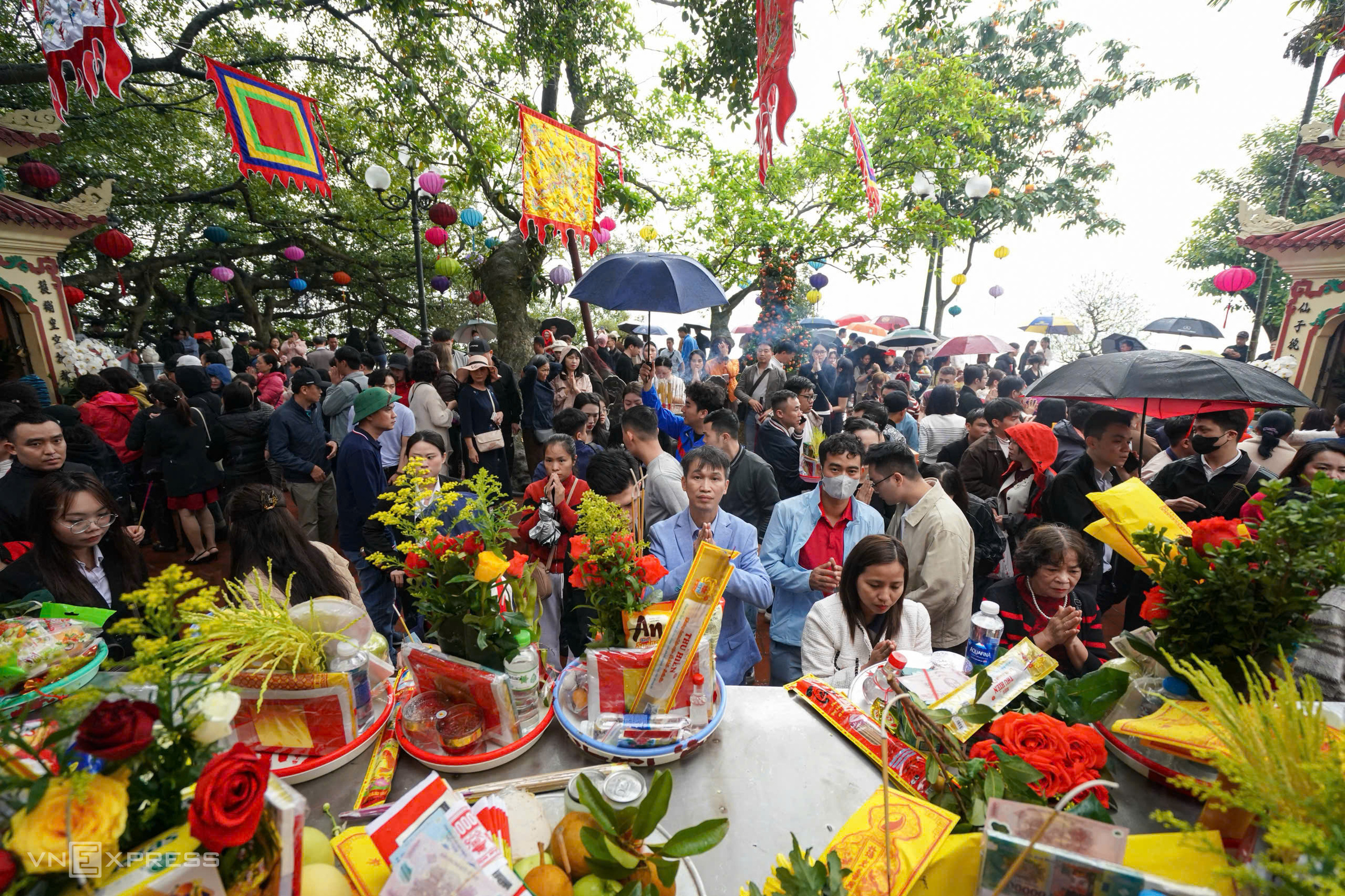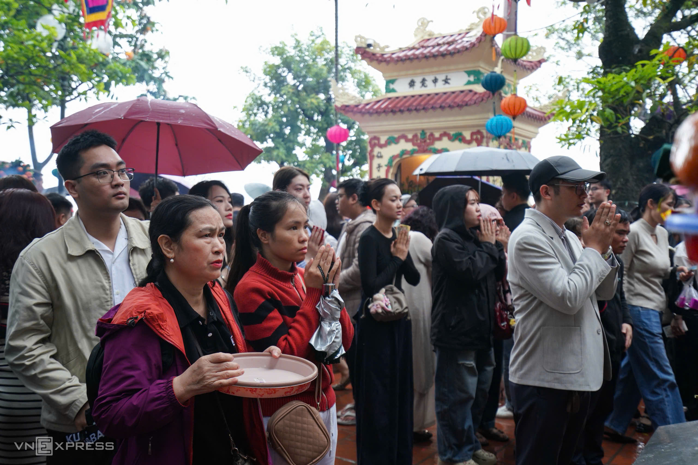 Despite the drizzle today in Hanoi, people bustled into Phu Tay Ho (Tay Ho ward) to perform their rituals. The number of visitors surged at noon, during office lunch breaks. Many employees used this time to visit temples at the beginning of the year, praying for health and peace for themselves and their families.