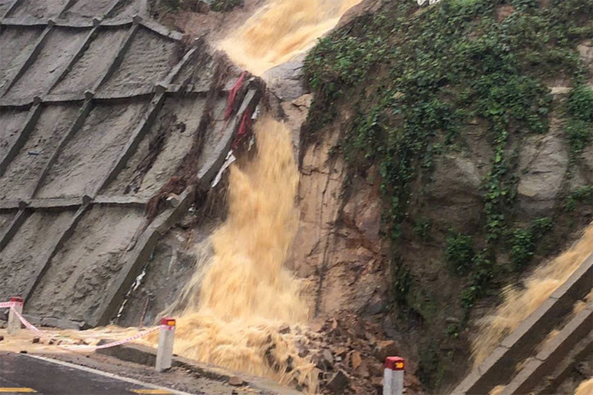 Around 9:15 AM, police set up barriers blocking vehicles as rainwater flowed down the embankment, creating a swift current carrying rocks and gravel onto the road. Some areas on the mountainside cracked, threatening to collapse the concrete upslope embankment.