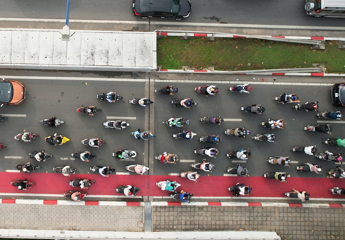 Motorcycles encroaching on the dedicated bicycle lane (red) on Mai Chi Tho street, morning of 6/1. Photo: Dinh Van