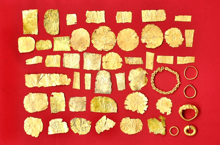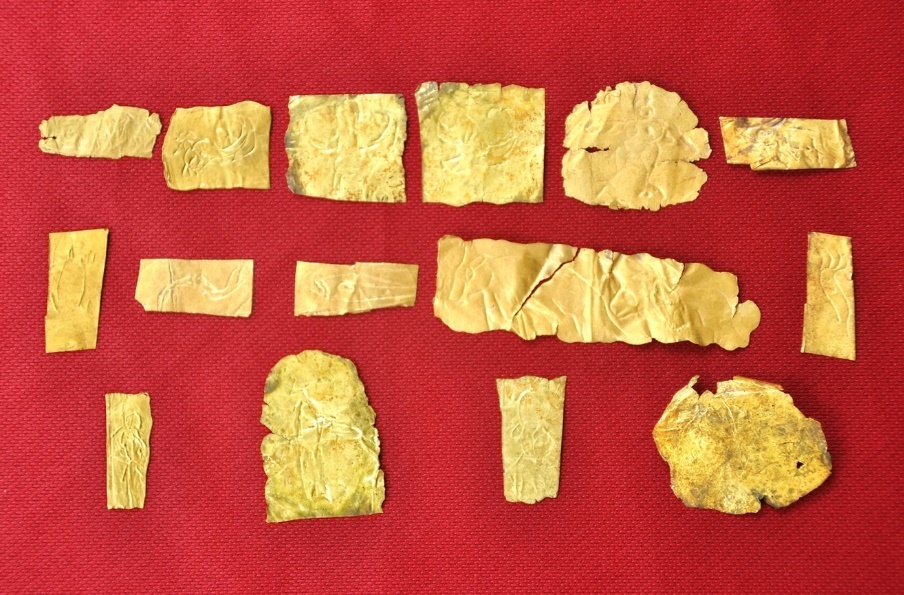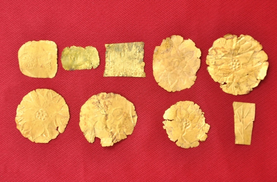 Archaeologists have excavated a total of 395 gold leaves, 156 of which are engraved with patterns and inscriptions. The gold leaves are very thin, ranging from 0.3 to 6.2 cm in length and 0.3 to 3.7 cm in width. The circular pieces have diameters from 1.1 to 3.7 cm.