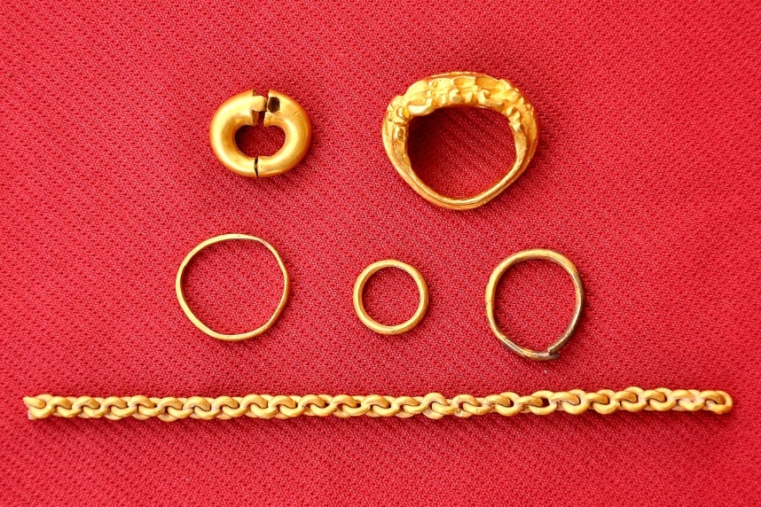 The gold jewelry collection includes an earring with a diameter of 2.2 cm and a weight of 2 chi (a traditional Vietnamese unit of weight). It has a clasp, is flat and round, and has no decorative patterns. There are also four gold rings weighing from 0.32 to 5.8 chi and a gold chain 11.7 cm long, made of 28 figure-eight links, similar to modern gold chains.